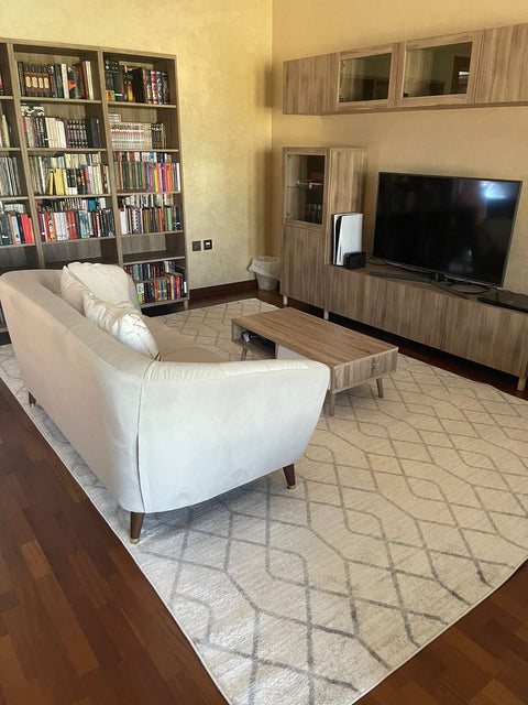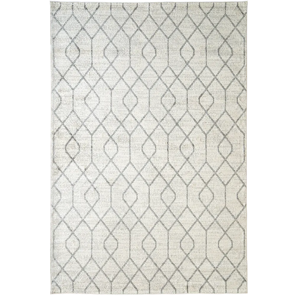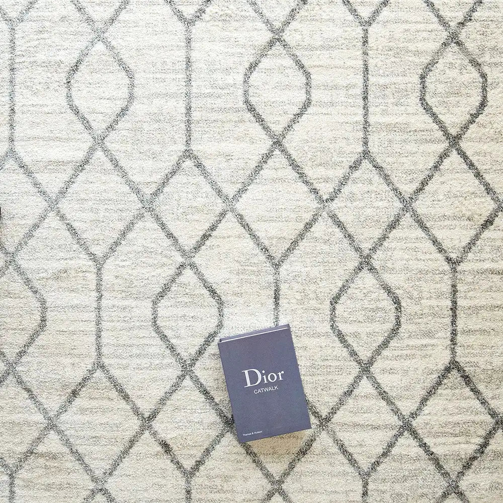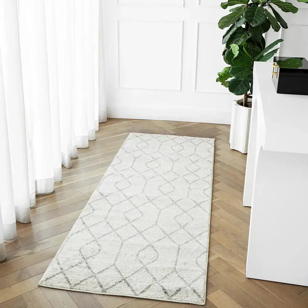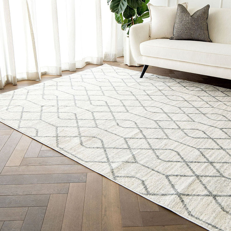 With a geometric design and soft, plush feel, this ivory and grey rug is a stylish way to bring cosy warmth to your interior.