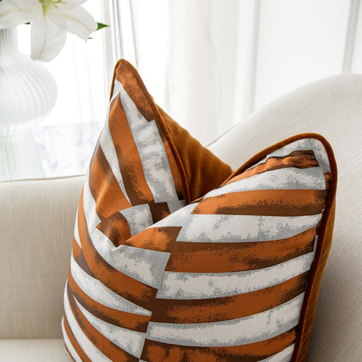 التصميم: وسادتين بنمط ثلاثي الأبعاد باللون البرتقالي والأبيض والرمادي، وسادتين رماديتين، ووسادة بلون أبيض