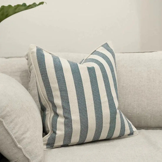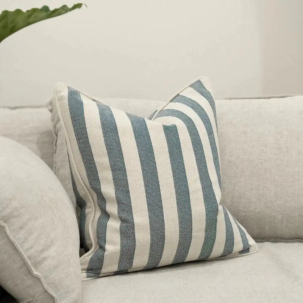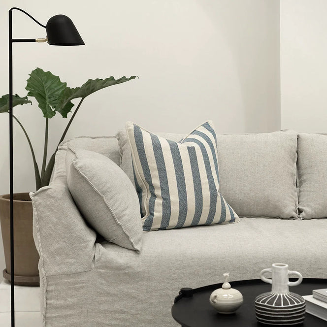 هذه الوسادة المخططة بالأزرق والأبيض تحمل طابعاً منعشاً. مصنوعة من القطن الخالص، بخطوط عريضة من الأمام والخلف لتحول غرفة المعيشة لديك إلى ملاذ ساحلي.
