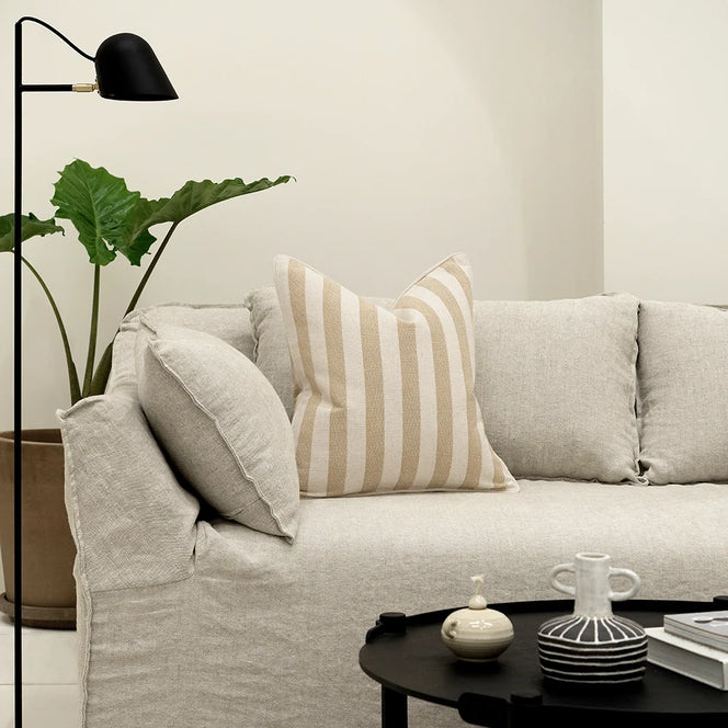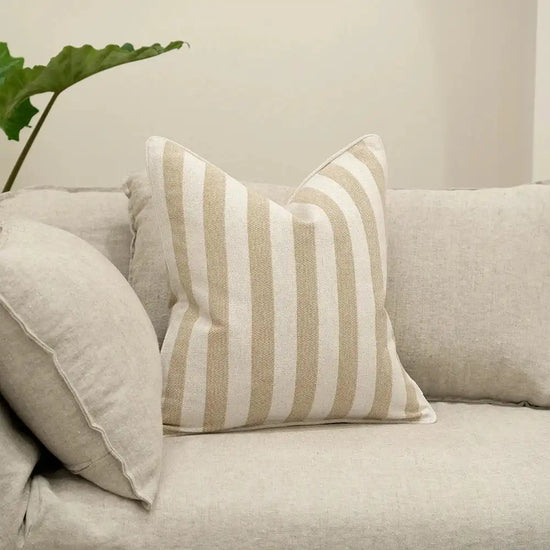 بألوان البيج والأبيض، ستندمج هذه الوسادة المخططة بسهولة مع أي لوحة ألوان. وسادة بألوان محايدة مع خطوط تغطي التصميم بالكامل لتجديد موسمي بسيط.