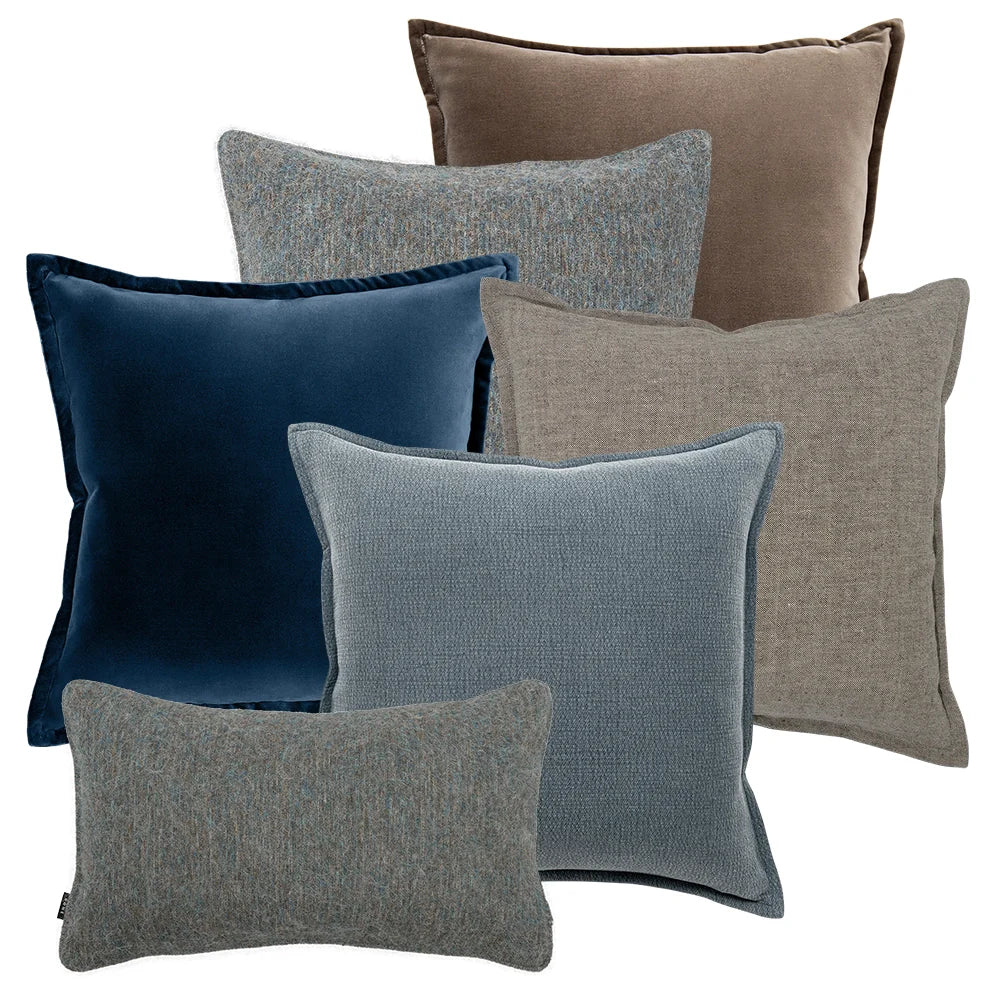 استمتع بالدفء والأناقة مع مجموعة الوسائد باللون البني والرمادي والأزرق هذه. تضم المجموعة وسائد مخملية ناعمة، ووسادة سادة وأخرى بنسيج مميز لتشكيل مجموعة عصرية.