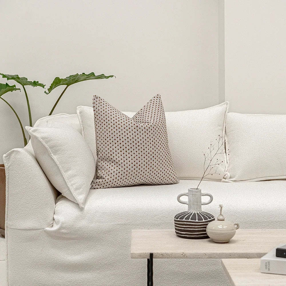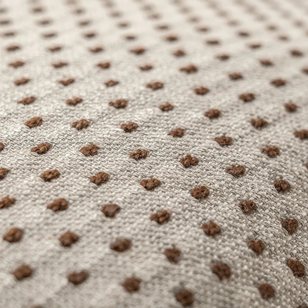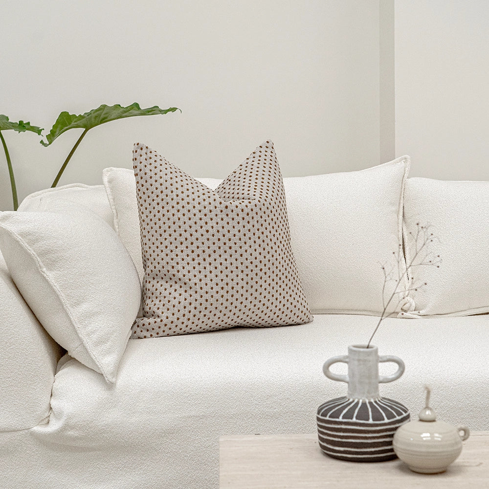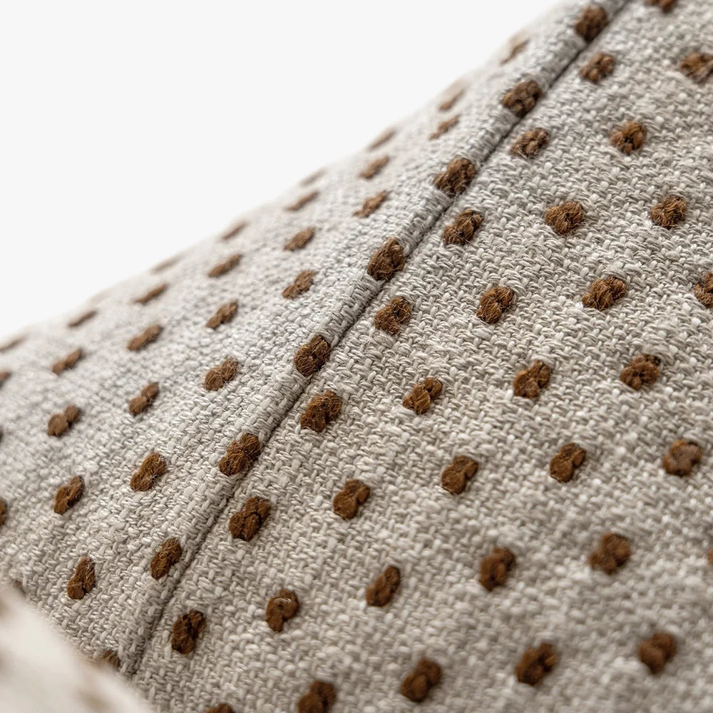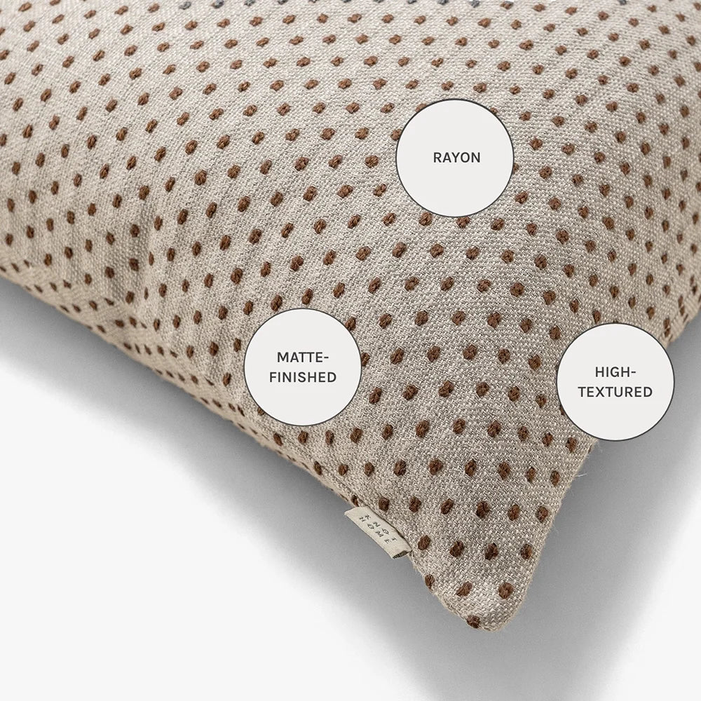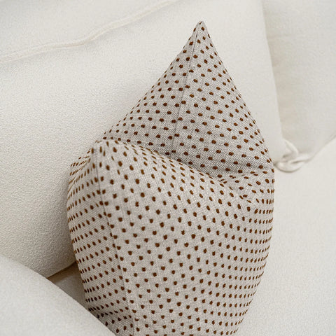أضف لوناً وملمساً رائعًا لغرفة المعيشة مع هذه الوسادة المنقطة. وسادة باللون البيج والصدأ مزينة بنمط نقاط صغيرة تغطيها بالكامل لتكمل الأثاث الكلاسيكي والعصري على حد سواء