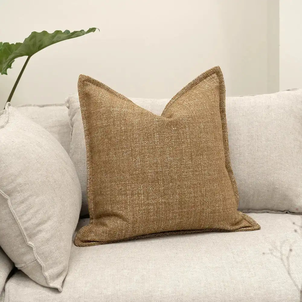 أضف الدفء إلى ديكورك مع هذه الوسادة باللون البني الذهبي. تأتي بحافة عريضة أنيقة ولمسة فاخرة، لتمنح دفئاً وترحيباً لأريكتك.