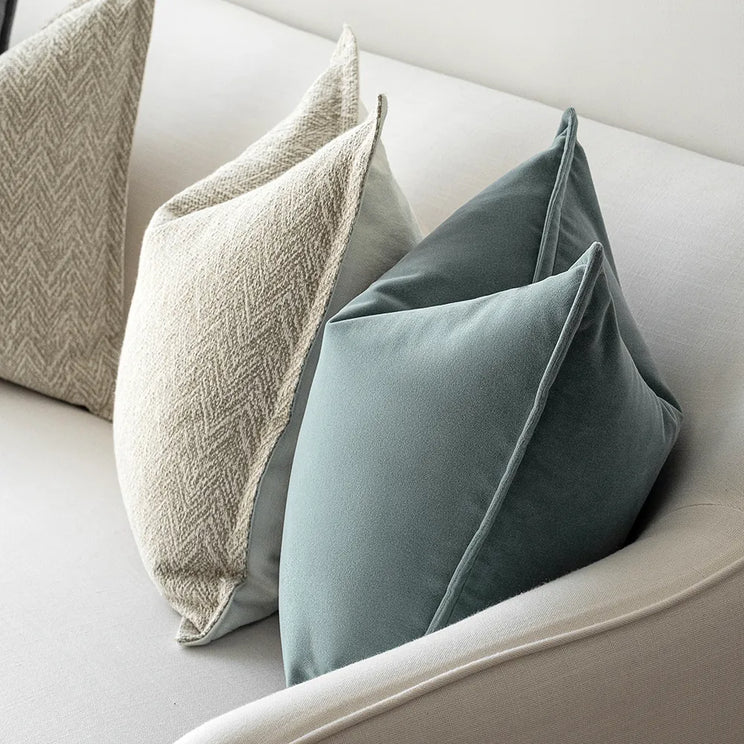 التصميم: وسادتان من المخمل الأزرق الفاتح ووسادتان ذات تصميم متعرج مع ظهر متباين