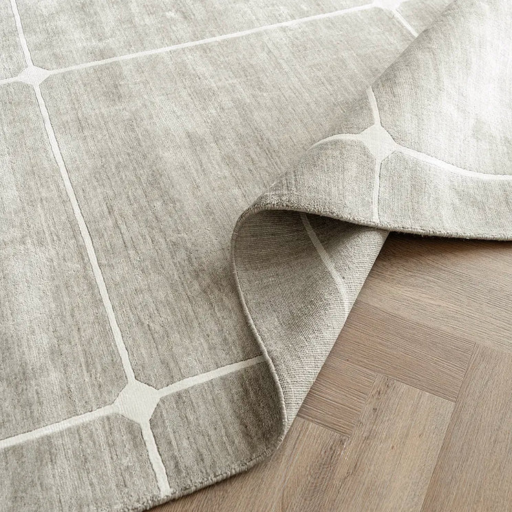يُضفي النمط الشبكي واسع النطاق لمسةً عصريةً على هذه السجادة المحايدة. بدرجاتها الهادئة من اللونين الرمادي والعاجي، تتميز بلمسة من اللمعان تجعلها إضافةً عصريةً فوريةً لمنزلك.