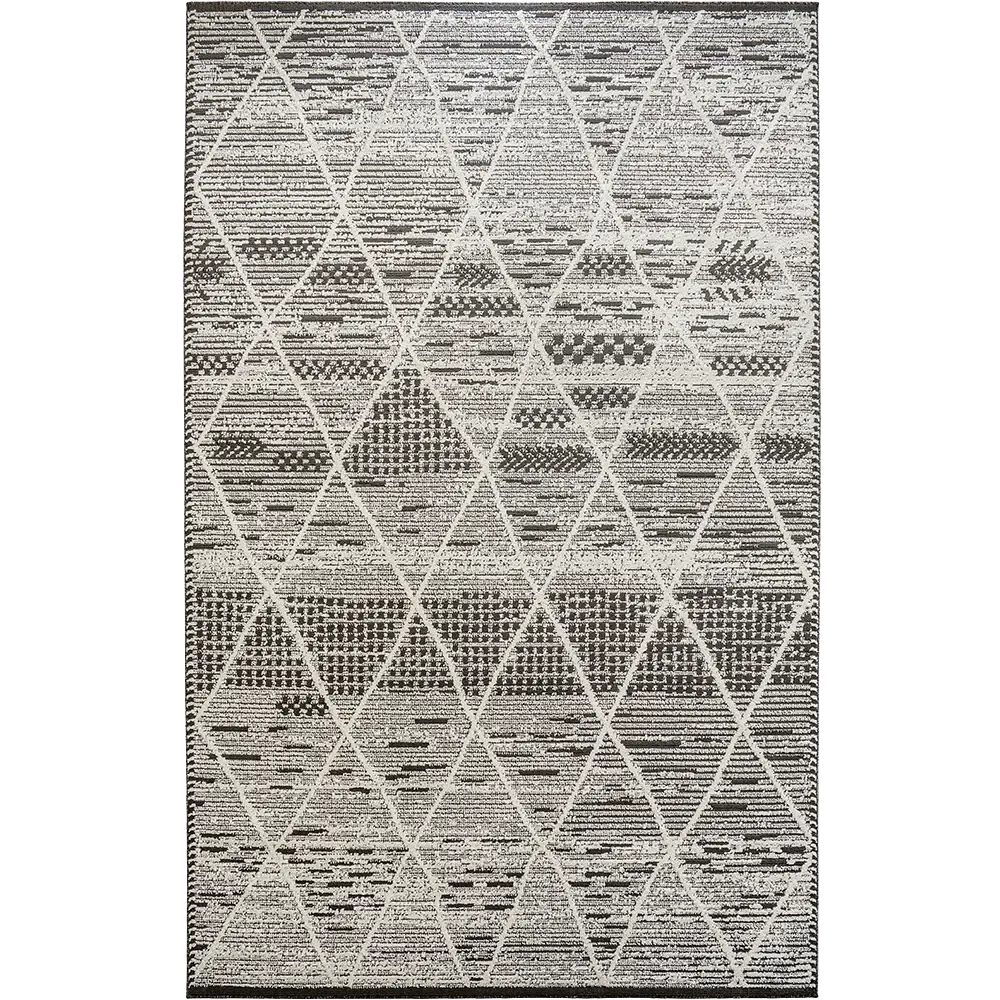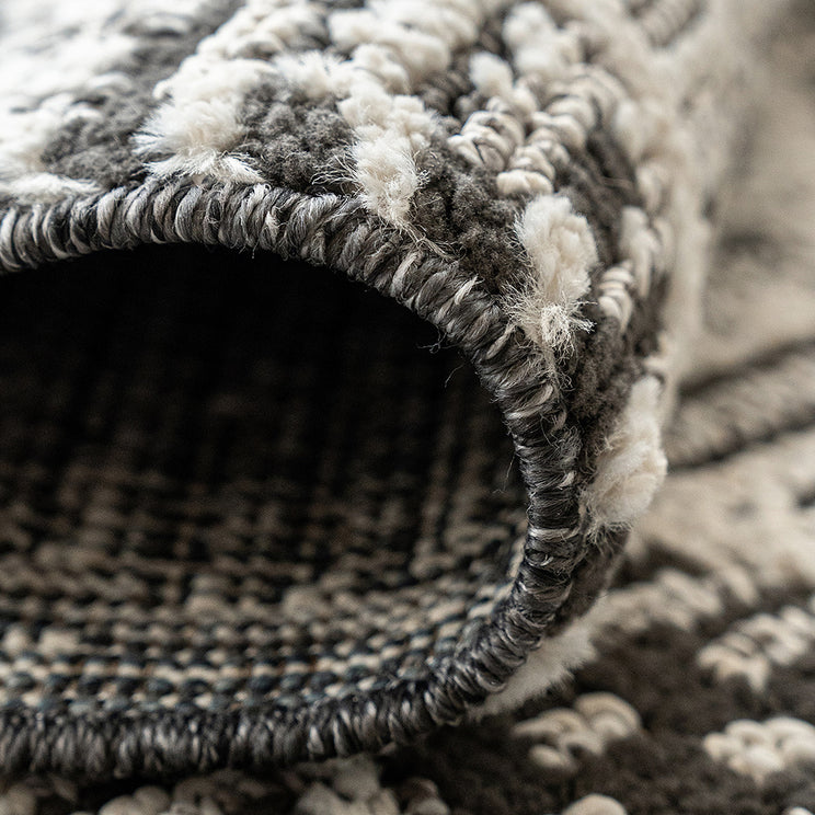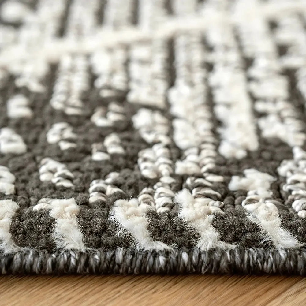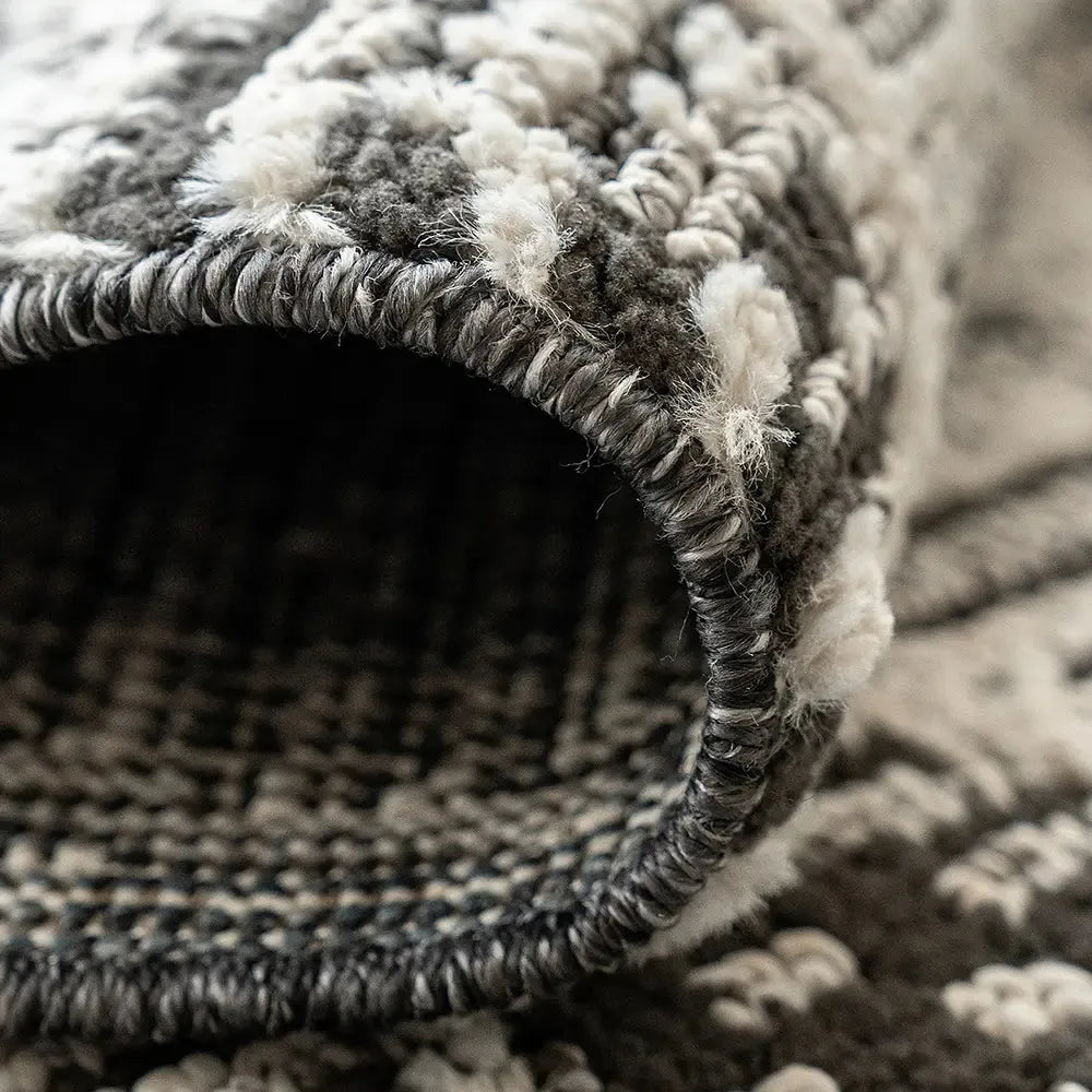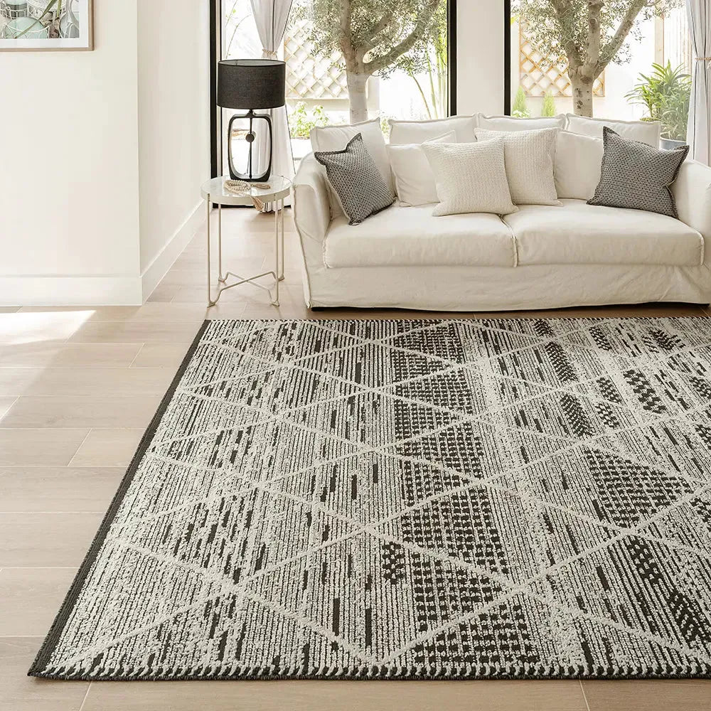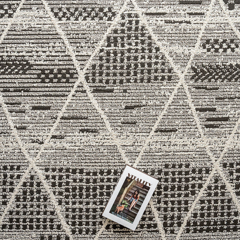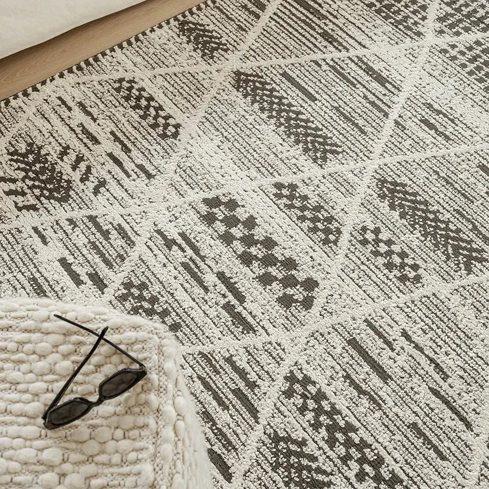 سجادة بتصميم بنمط الماسي وتفاصيل أنيقة من درجات اللون الرمادي الغامق والعاجي.
