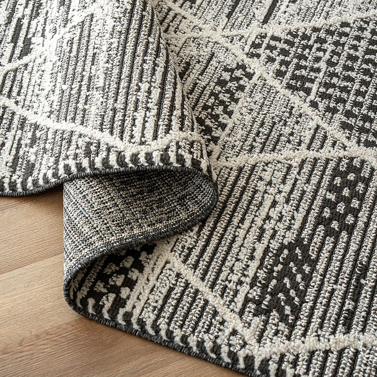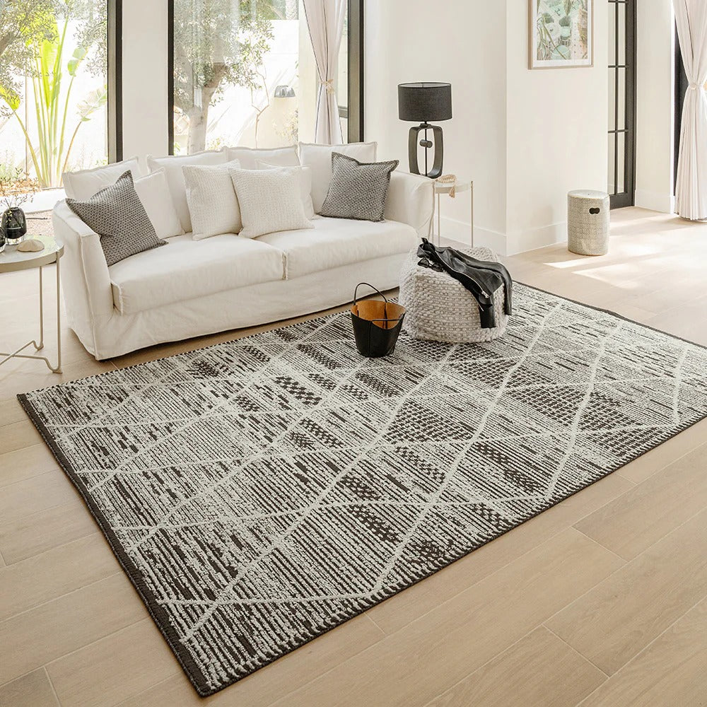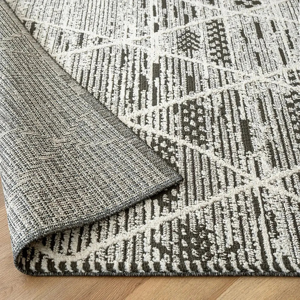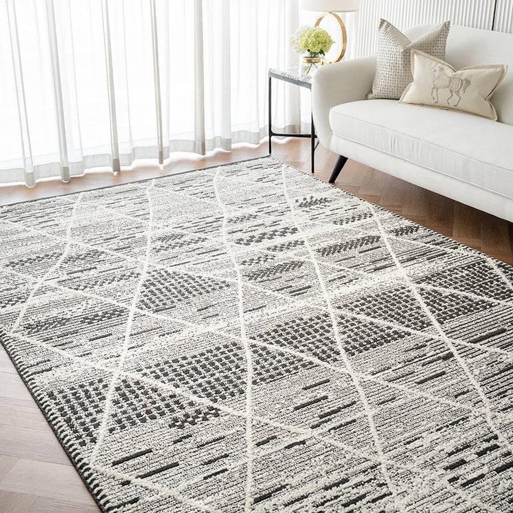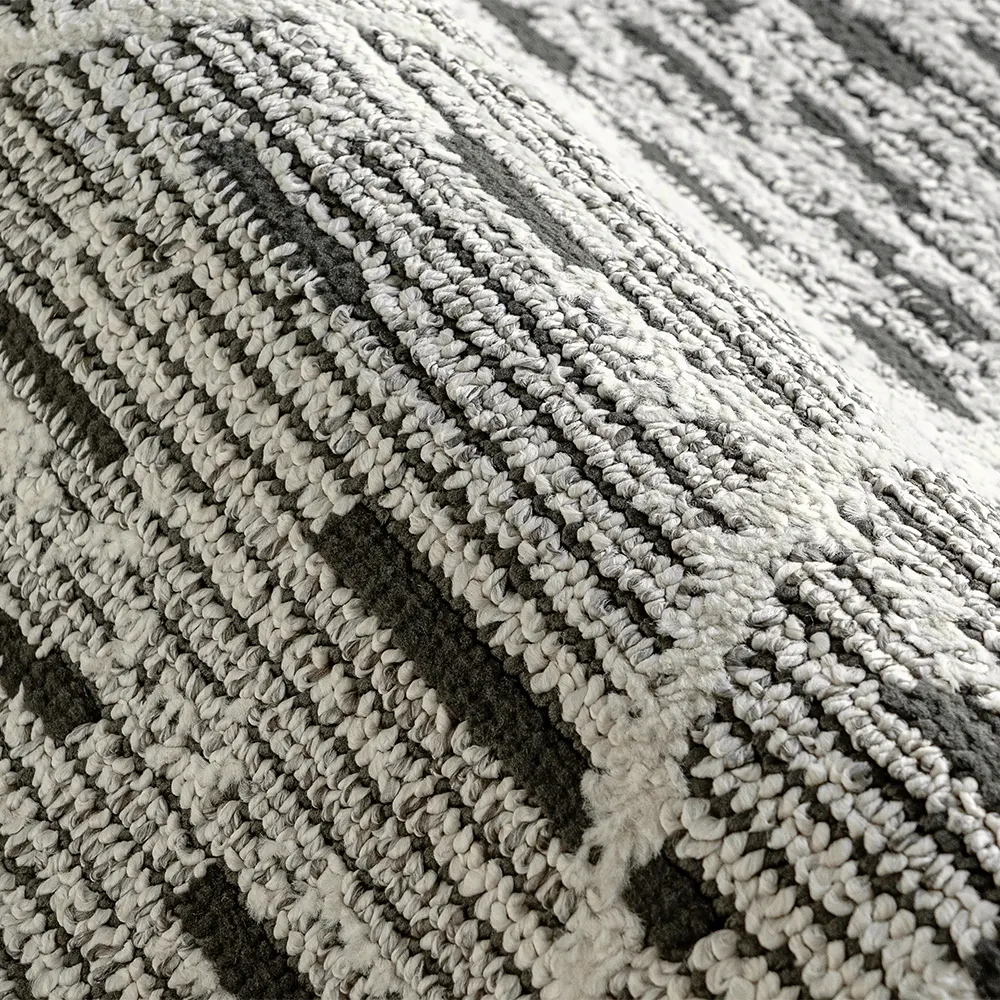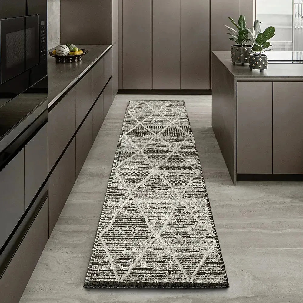 سجادة بتصميم بنمط الماسي وتفاصيل أنيقة من درجات اللون الرمادي الغامق والعاجي.