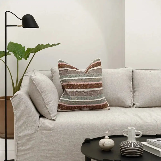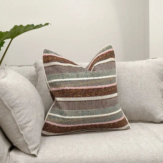 وسادة محاكة بملمس غني تجمع بين خطوط بنية ترابية وأخضر فاتح ووردي وعاجي. الخيوط المرقطّة والنسيج ذو الملمس المميز تمنحها مظهر يدوي دافئ مع لمسة شخصية.