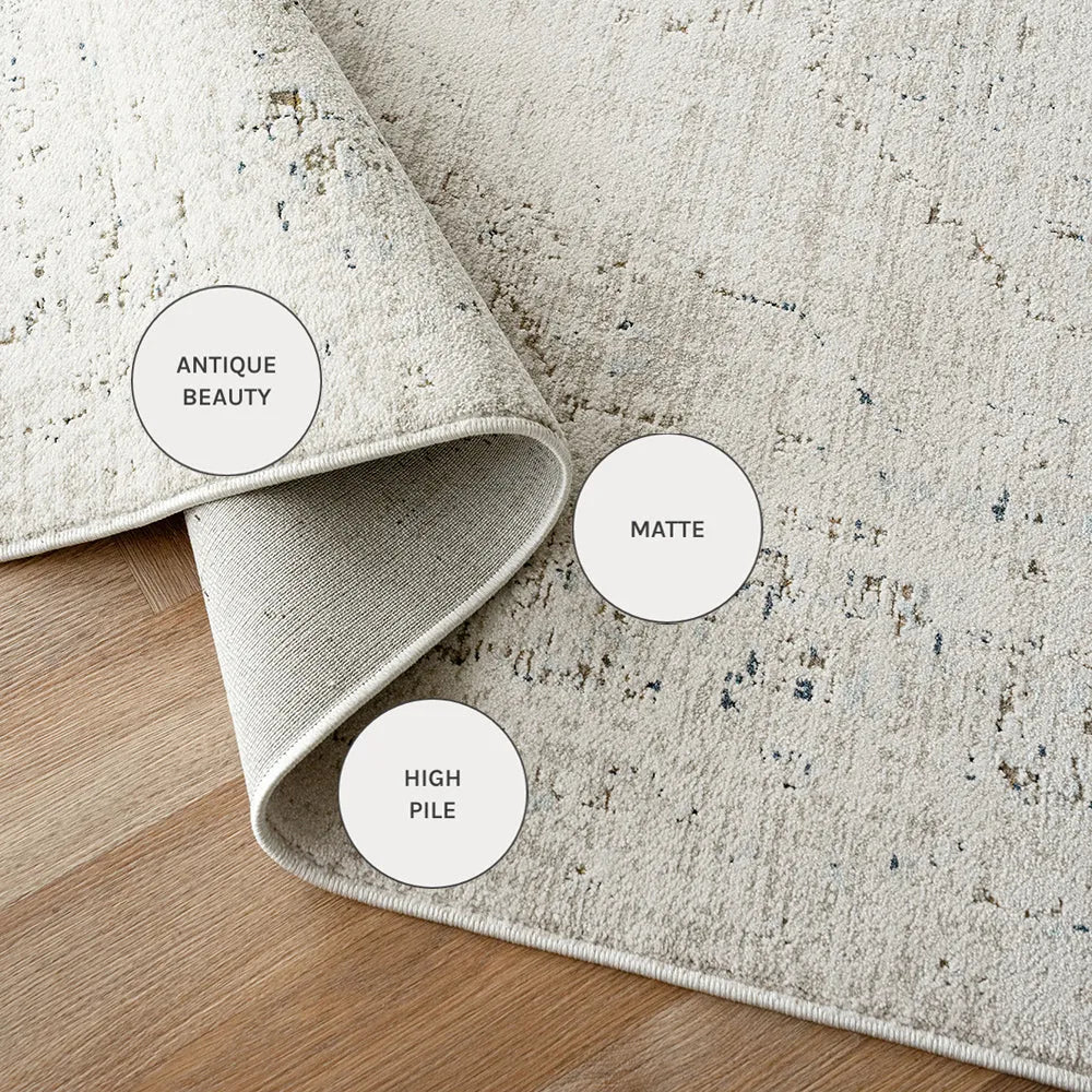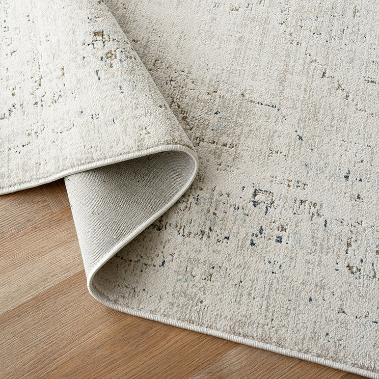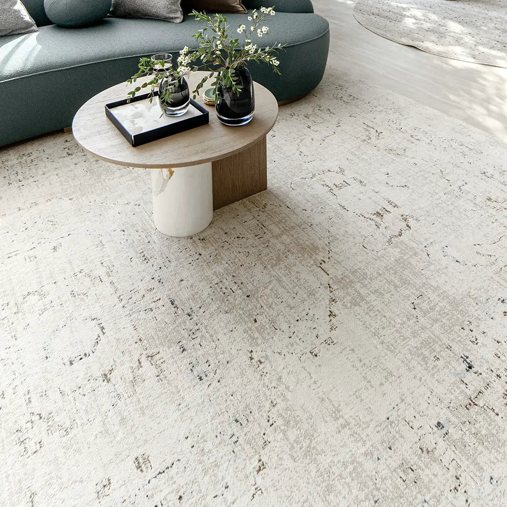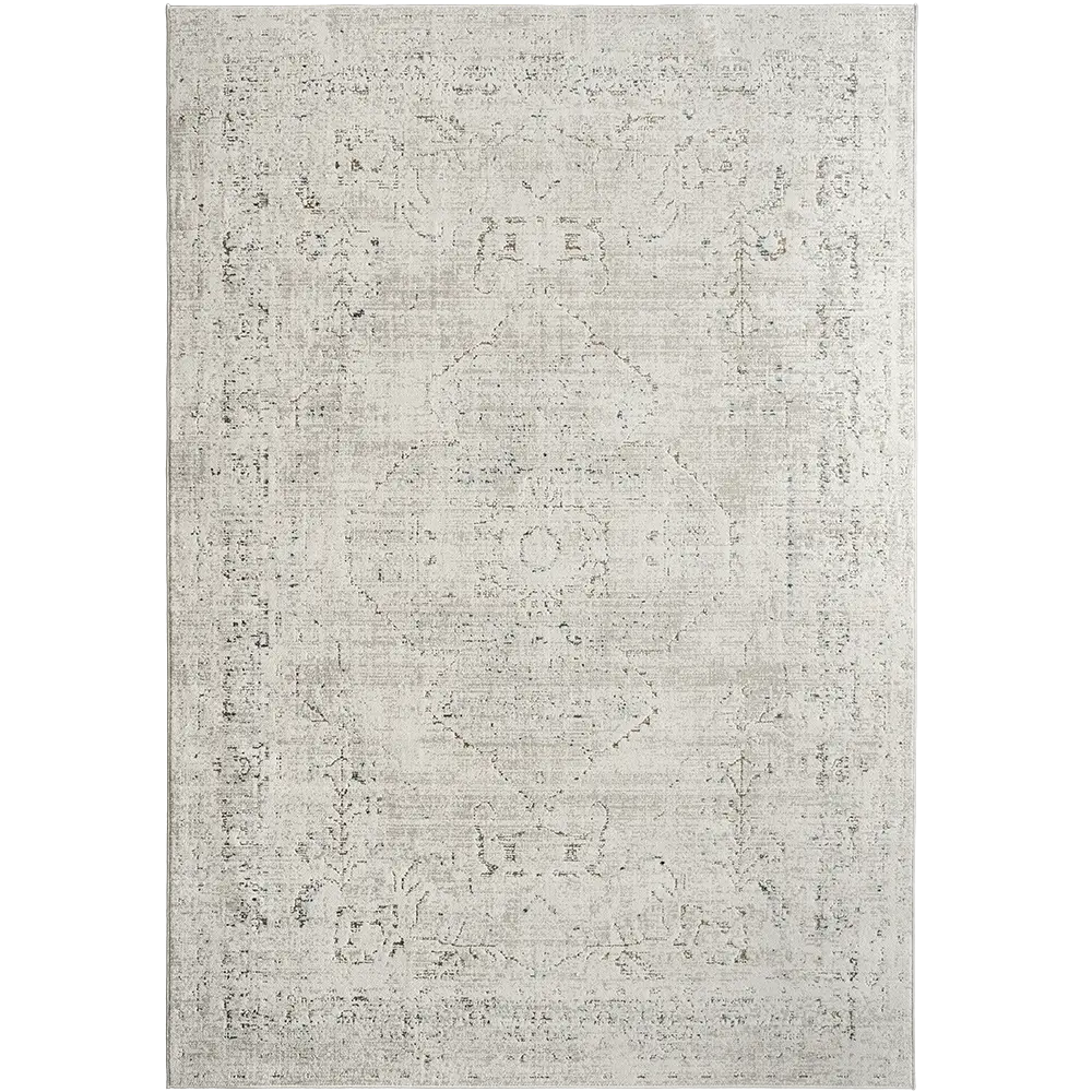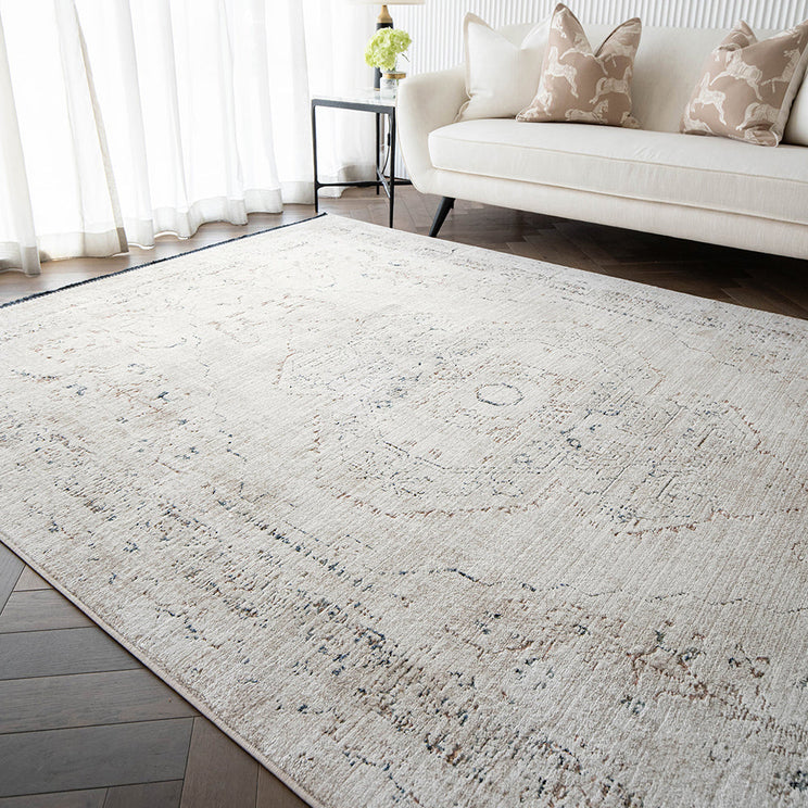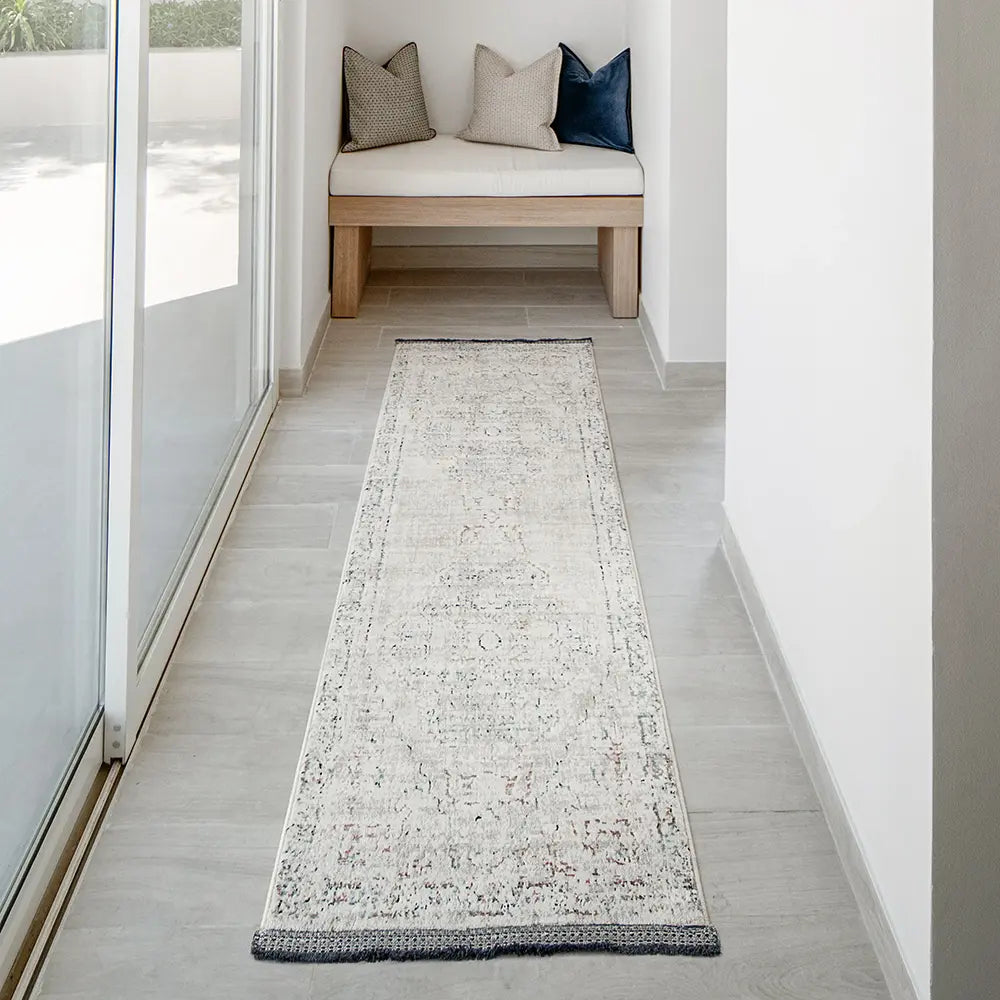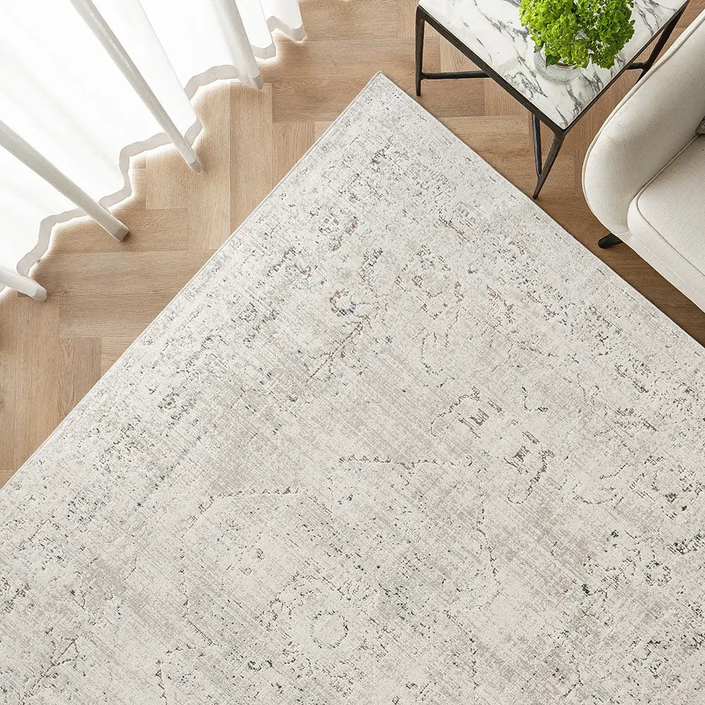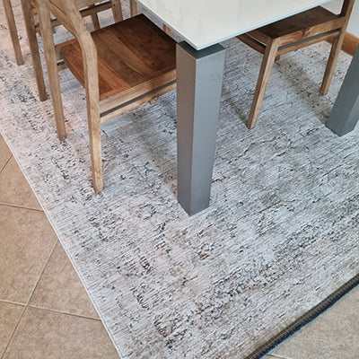 سجادة بنمط تقليدي ولون رمادي وبيج تمنح السحر إلى المكان.