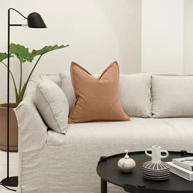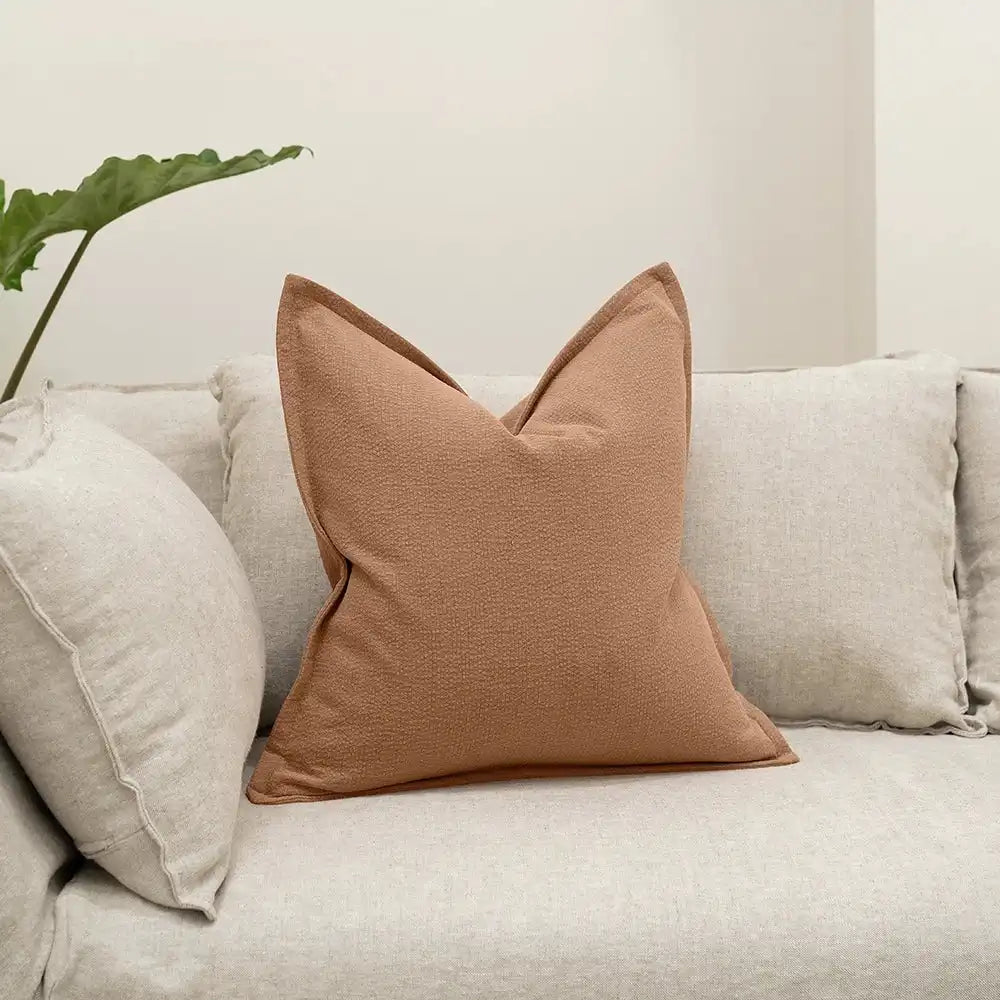 وسادة من قطن وكتان بملمس ناعم ولون طيني خافت، مغسولة برفق للحصول على مظهر طبيعي ومريح. اللون الهادئ والسطح ذو الملمس المميز يضيفان لمسة من الدفء والتوازن للمساحات المعاصرة.