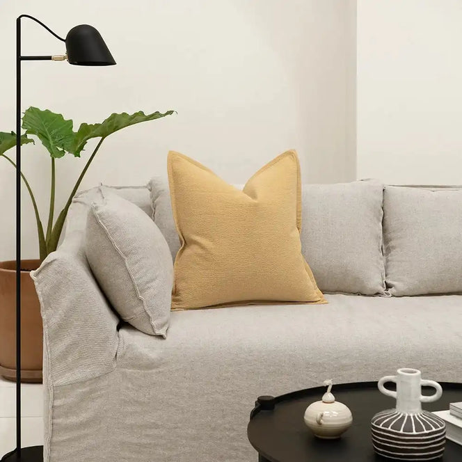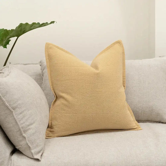 وسادة مصنوعة بالكامل من القطن والكتان بلون أصفر ترابي مغسول ناعم تمنحك إحساس بالهدوء والدفء كدفء الشمس. نسيجها الطبيعي والملمس المغسول يضفيان أناقة عفوية وهادئة.