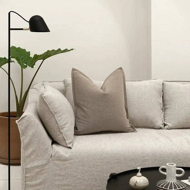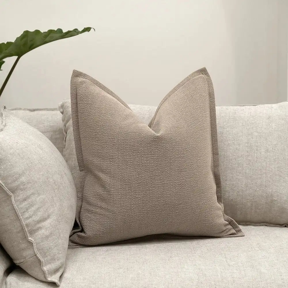 وسادة مصنوعة بالكامل من القطن والكتان بلون بيج فاتح وملمس مغسول بلطف. نسيجها الطبيعي وعمقها الخافت يضيفان حضورًا مريحًا ومتوازنًا لأي مساحة.