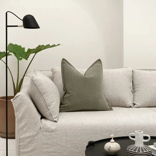 وسادة مصنوعة بالكامل من القطن والكتان بلون أخضر فاتح وملمس مغسول طبيعي. يضفي نسيجها الناعم ولمعانها الخفيف لمسة من الأناقة العضوية الهادئة وسهلة التنسيق.