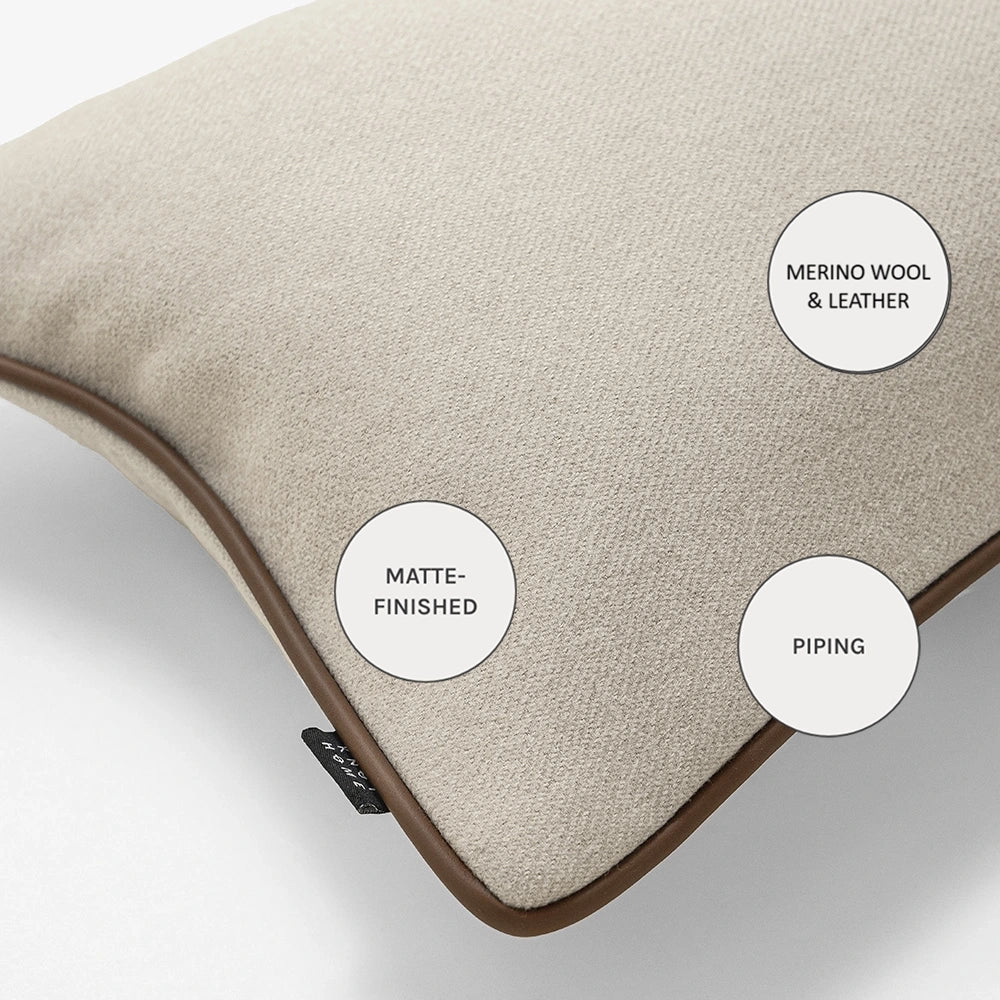 التصميم: وسادة من مزيج صوف ميرينو ناعم باللون الكريمي الدافئ مع حواف جلدية بنية لتحديد الخطوط وإضافة لمسة مصقولة