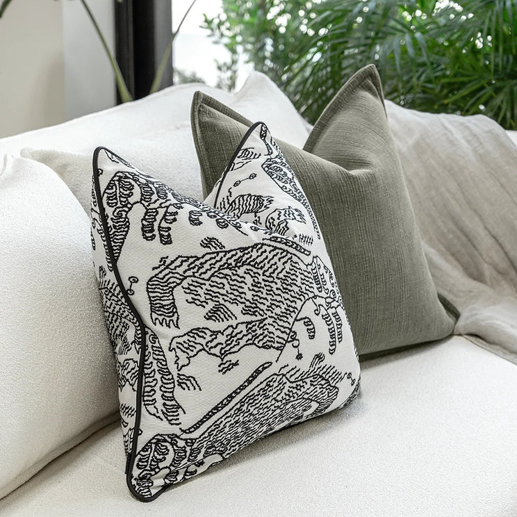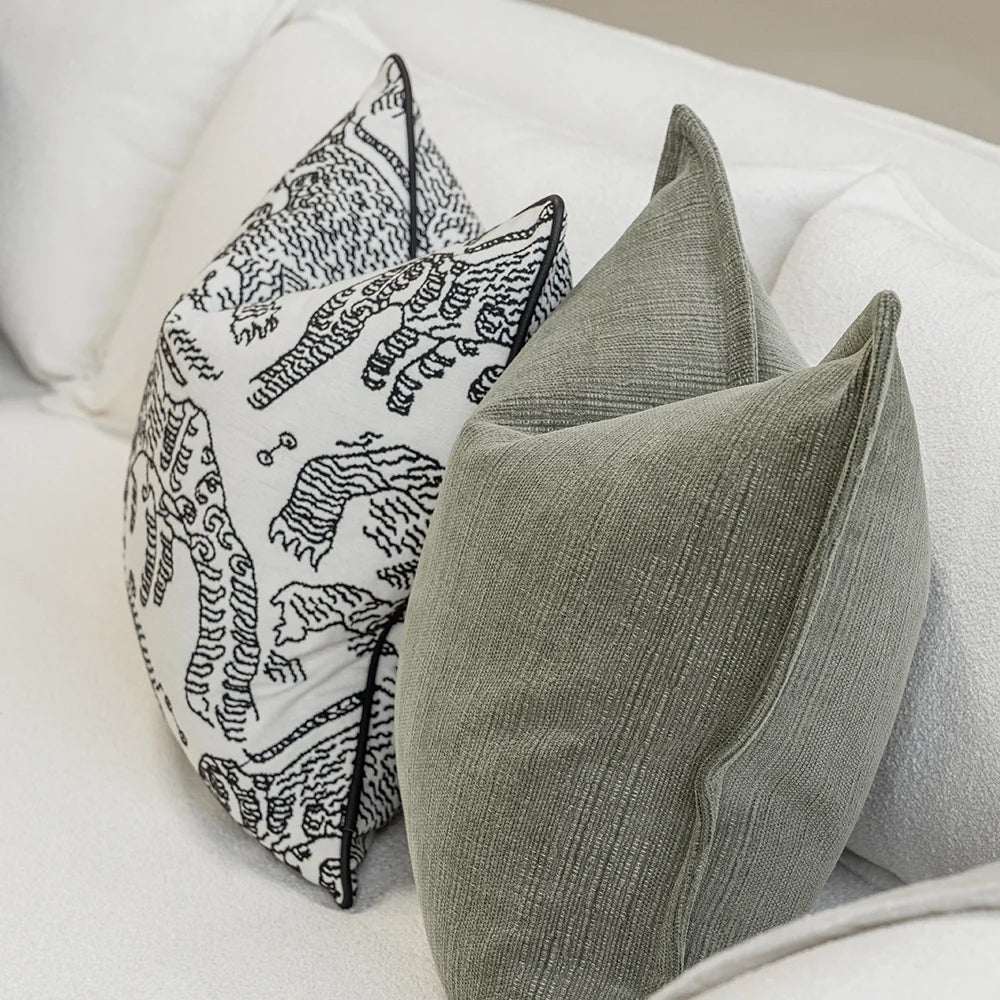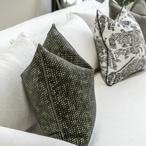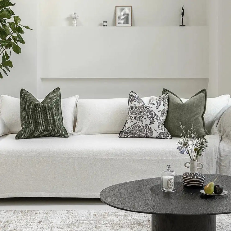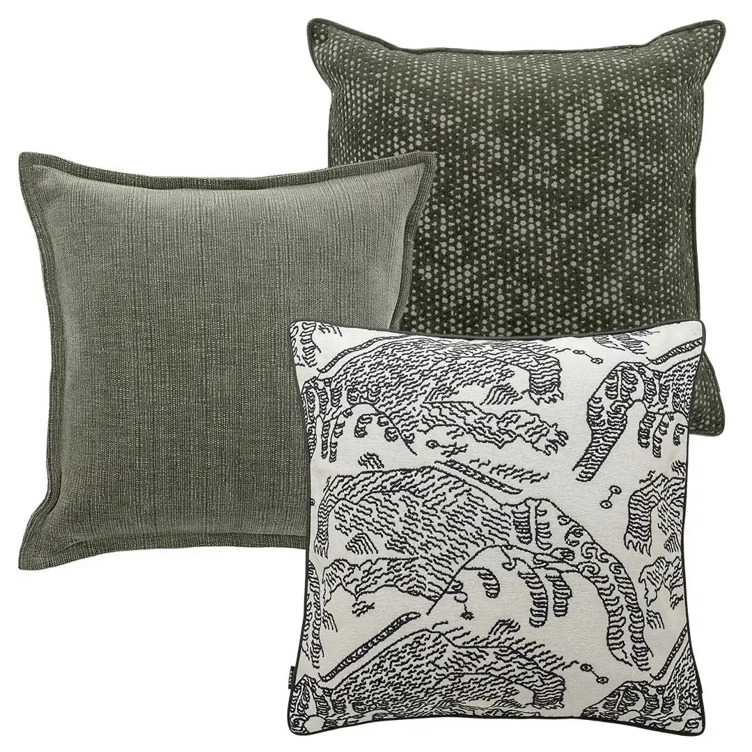 تضفي هذه المجموعة الجريئة المكونة من ثلاث وسائد لمسة فورية من الحيوية على غرفة المعيشة. تشمل وسادتين باللون الأخضر، وأخرى بنمط خطوط أبيض وأسود، لتبرز الأريكة بأسلوب عصري بلمسة شخصية.