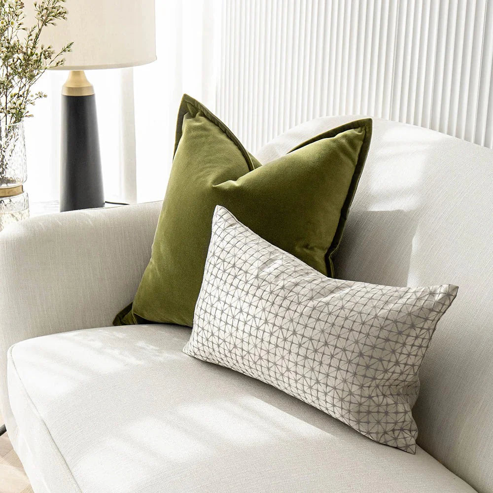 التصميم: وسادتين من المخمل باللون الأخضر ووسادة مزخرفة بنمط الماس باللون الفضي