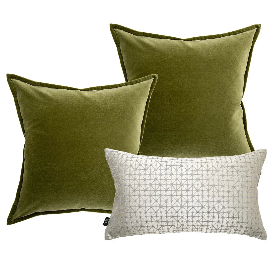 مجموعة تأتي بوسادتان من المخمل باللون الأخضر ووسادة مزخرفة بنمط الماس باللون الفضي.