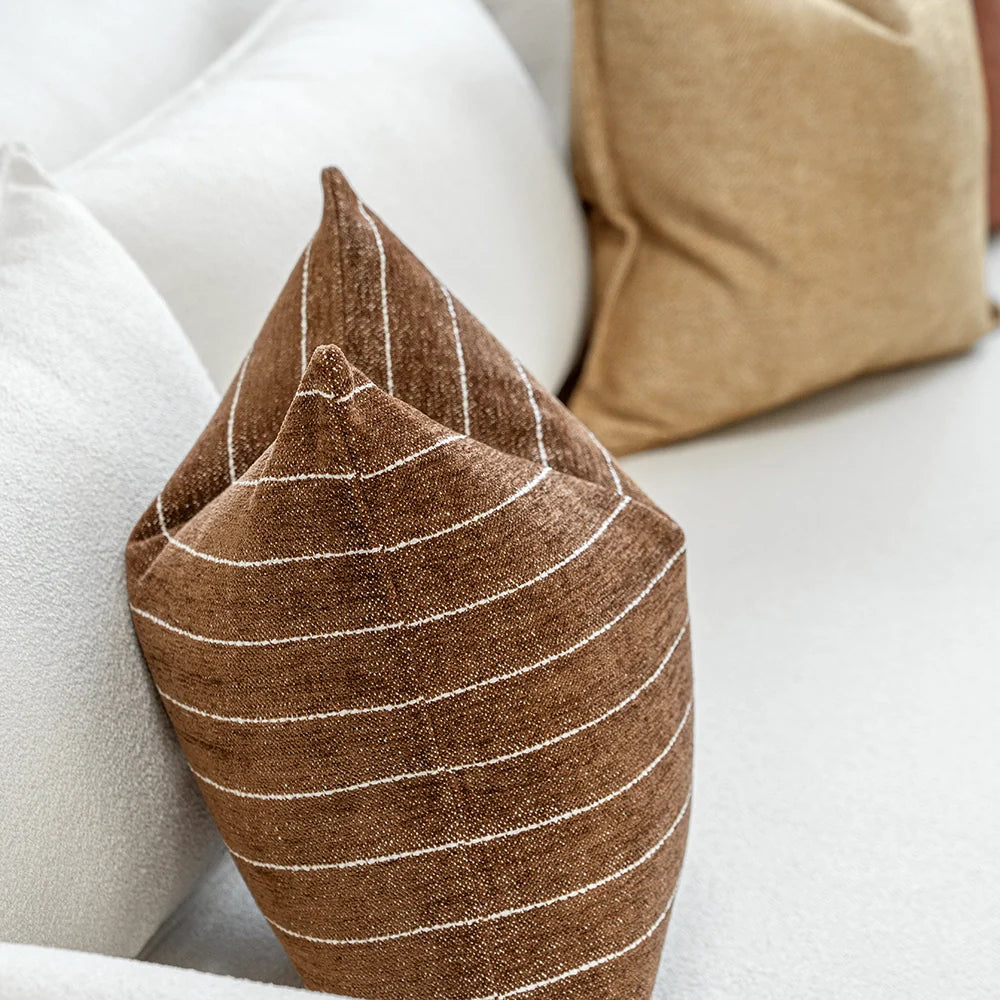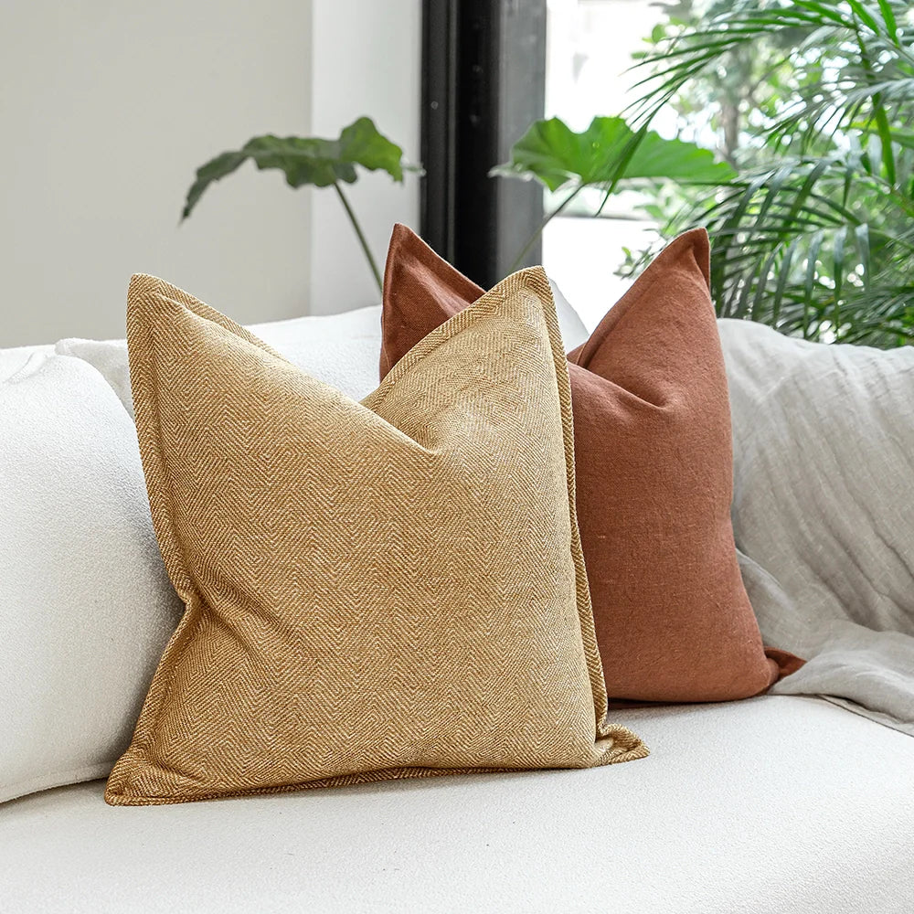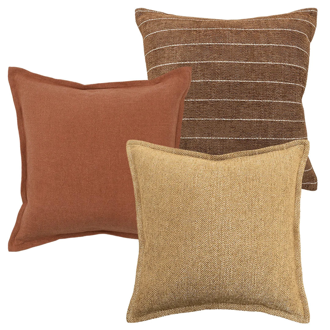 أضف لمسة من الدفء إلى غرفة المعيشة مع هذه المجموعة المكونة من ثلاثة وسائد باللونين البني والخردلي. تضم المجموعة وسائد سادة ومخططة وأخرى بنمط هيرينجبون، لتضفي لونًا وملمسًا متناسقًا على أي أريكة.