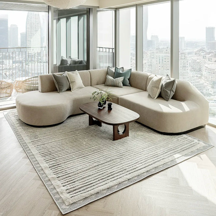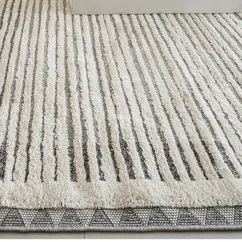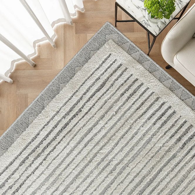 هذه السجادة باللون الرمادي والأيفوري مصنوعة من ألياف صناعية لتكون خيارًا عمليًا ومتينًا.