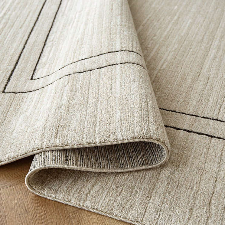 سجادة رقيقة وفاخرة من اللون البيج والأسود للمسة من الأناقة في المكان.