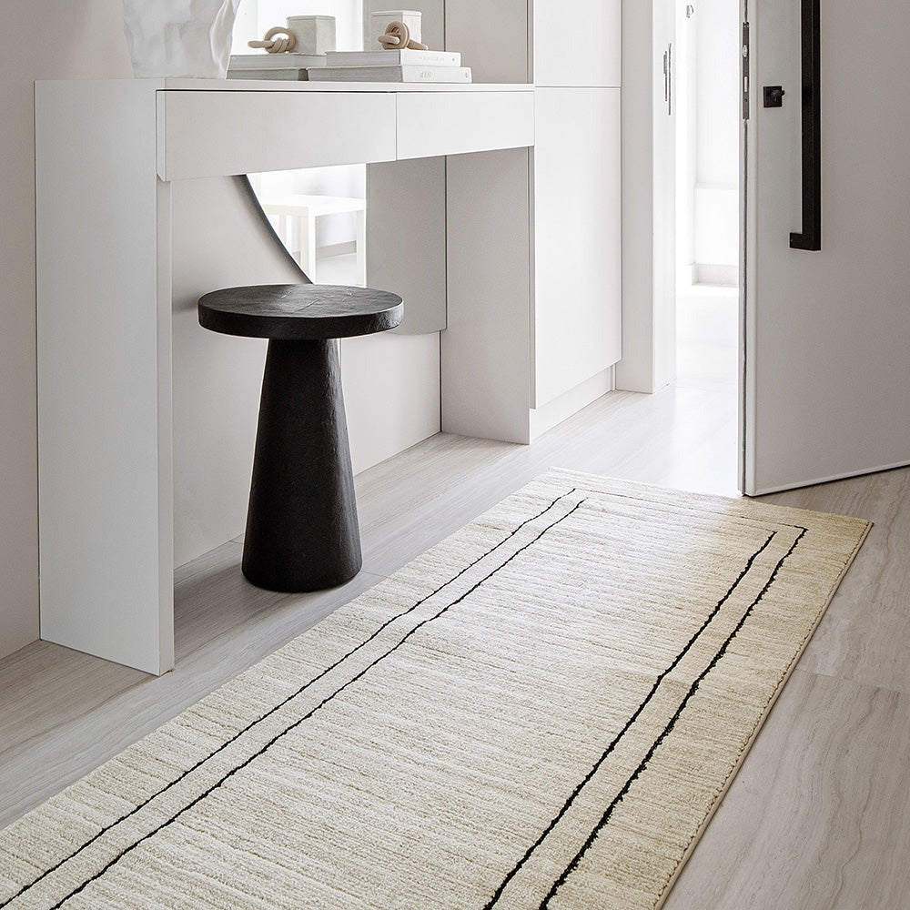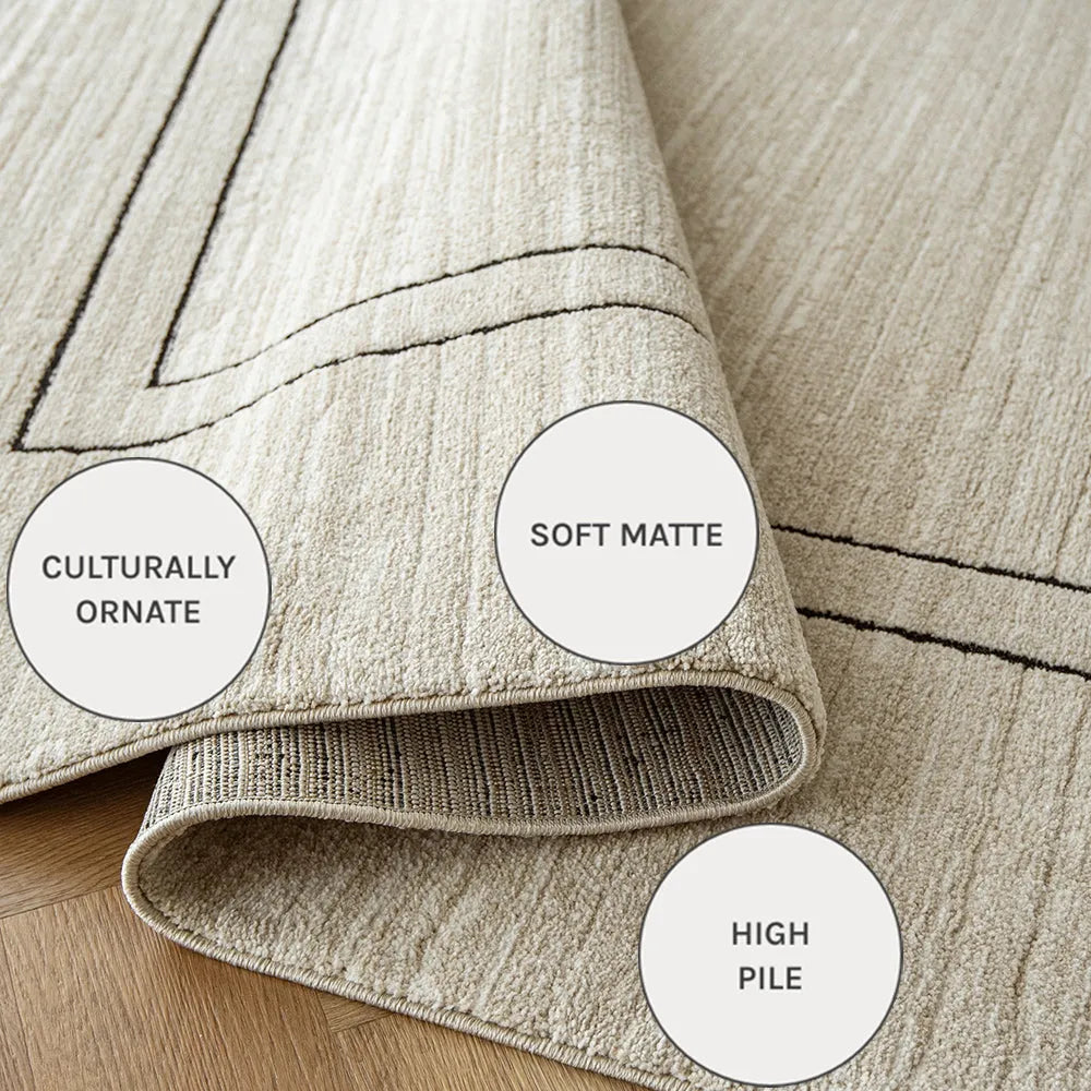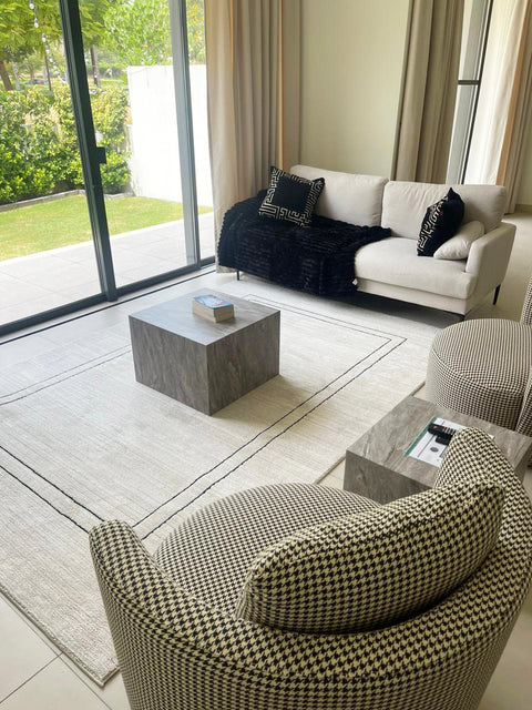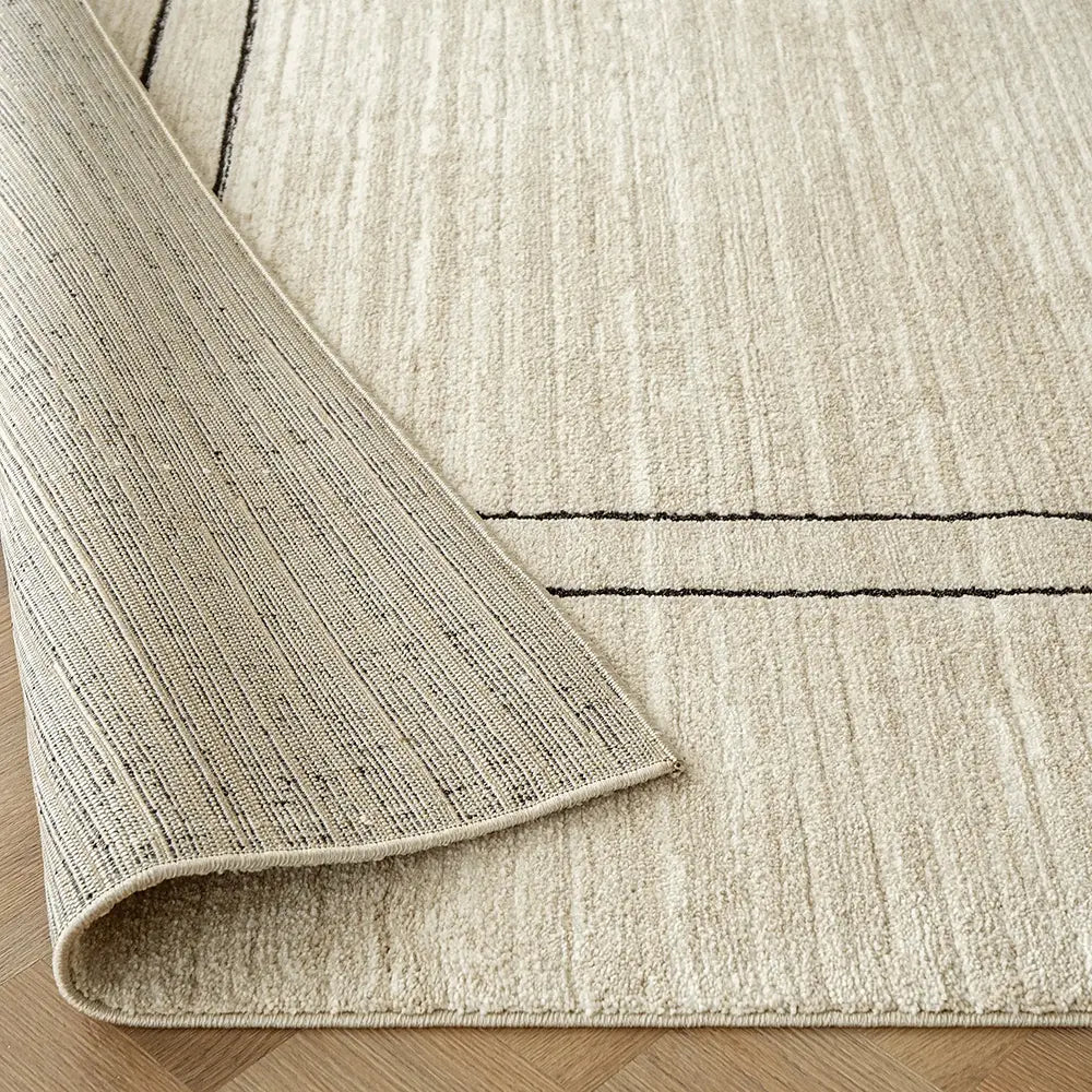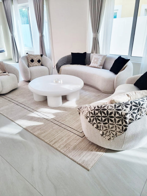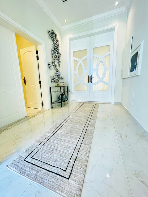سجادة رقيقة وفاخرة من اللون البيج والأسود للمسة من الأناقة في المكان.