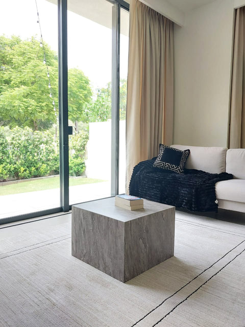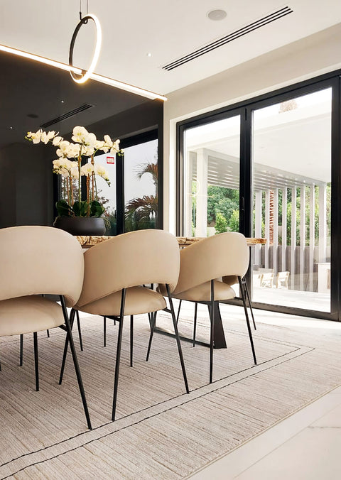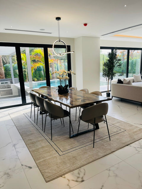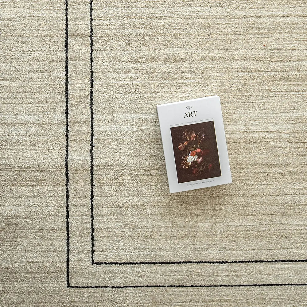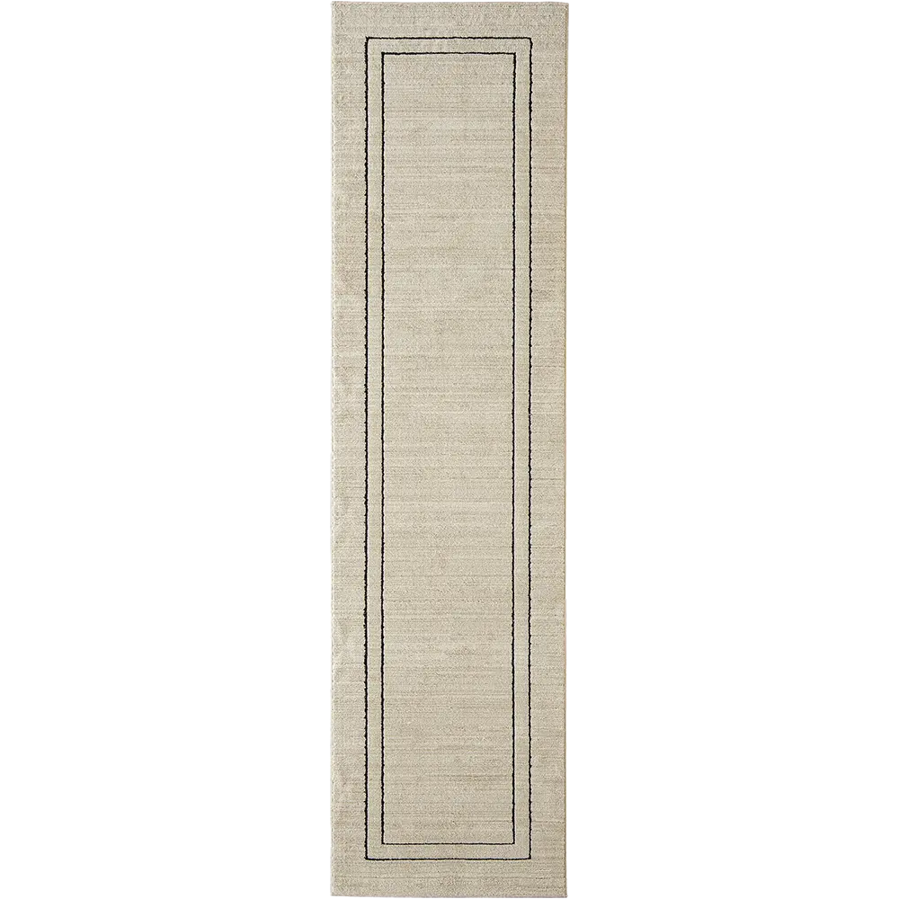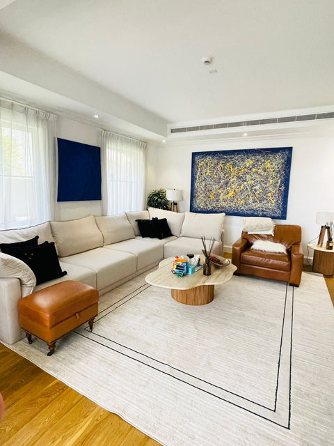 سجادة رقيقة وفاخرة من اللون البيج والأسود للمسة من الأناقة في المكان.