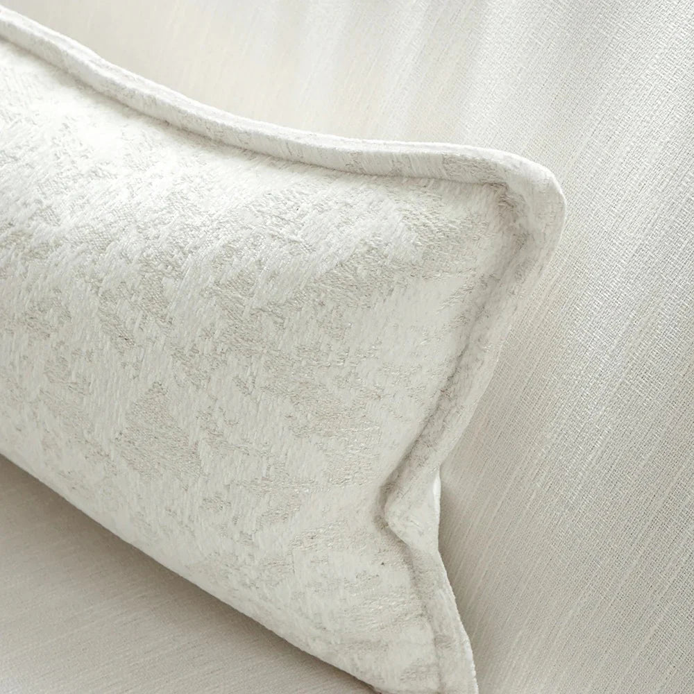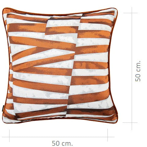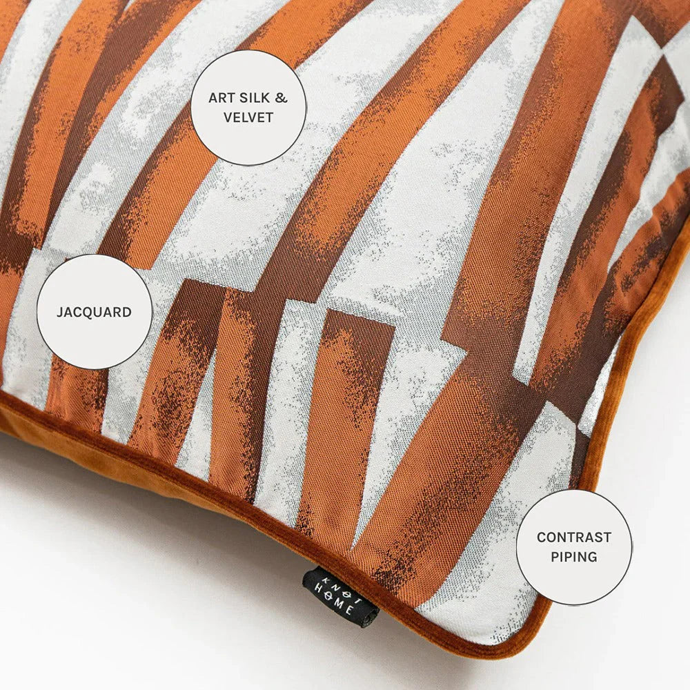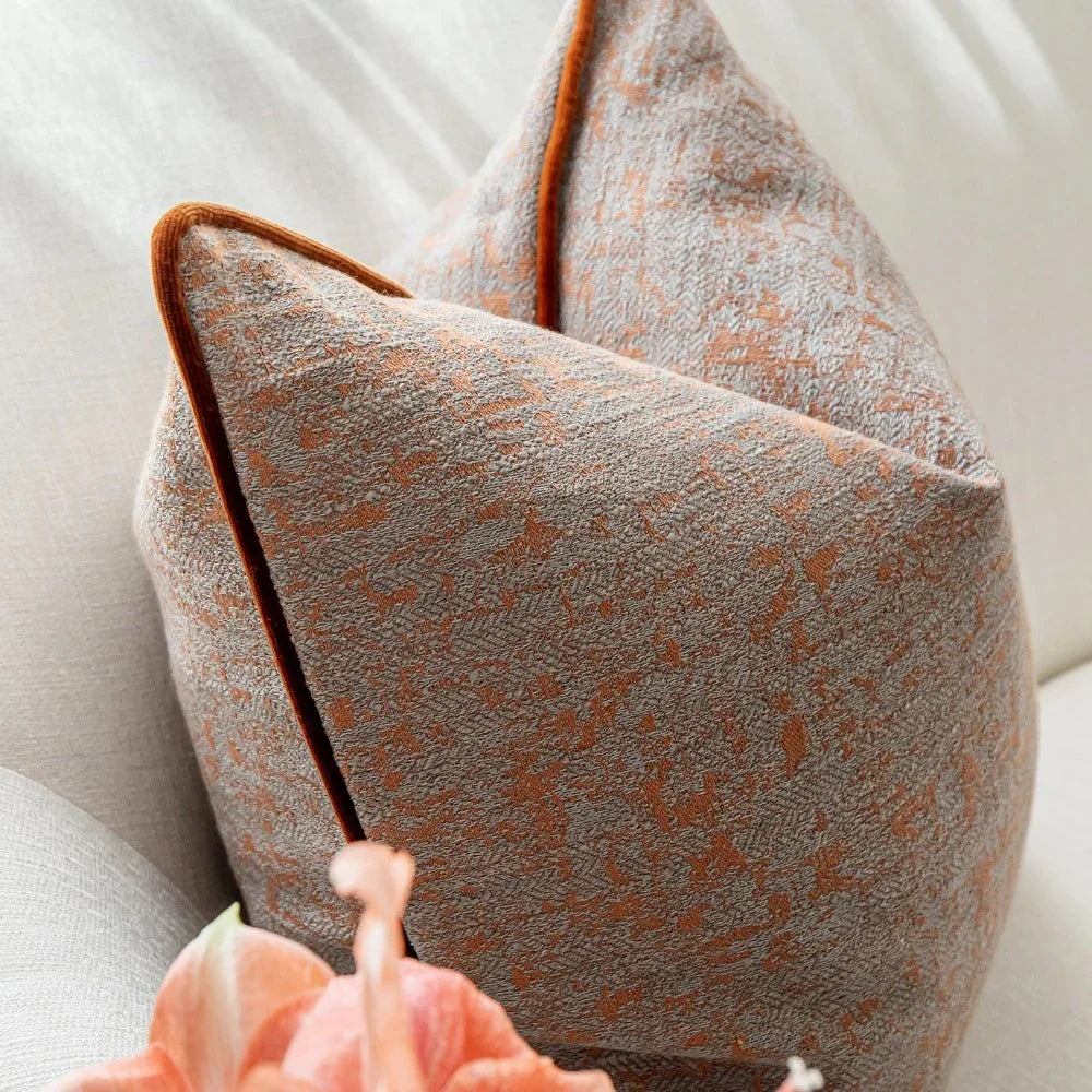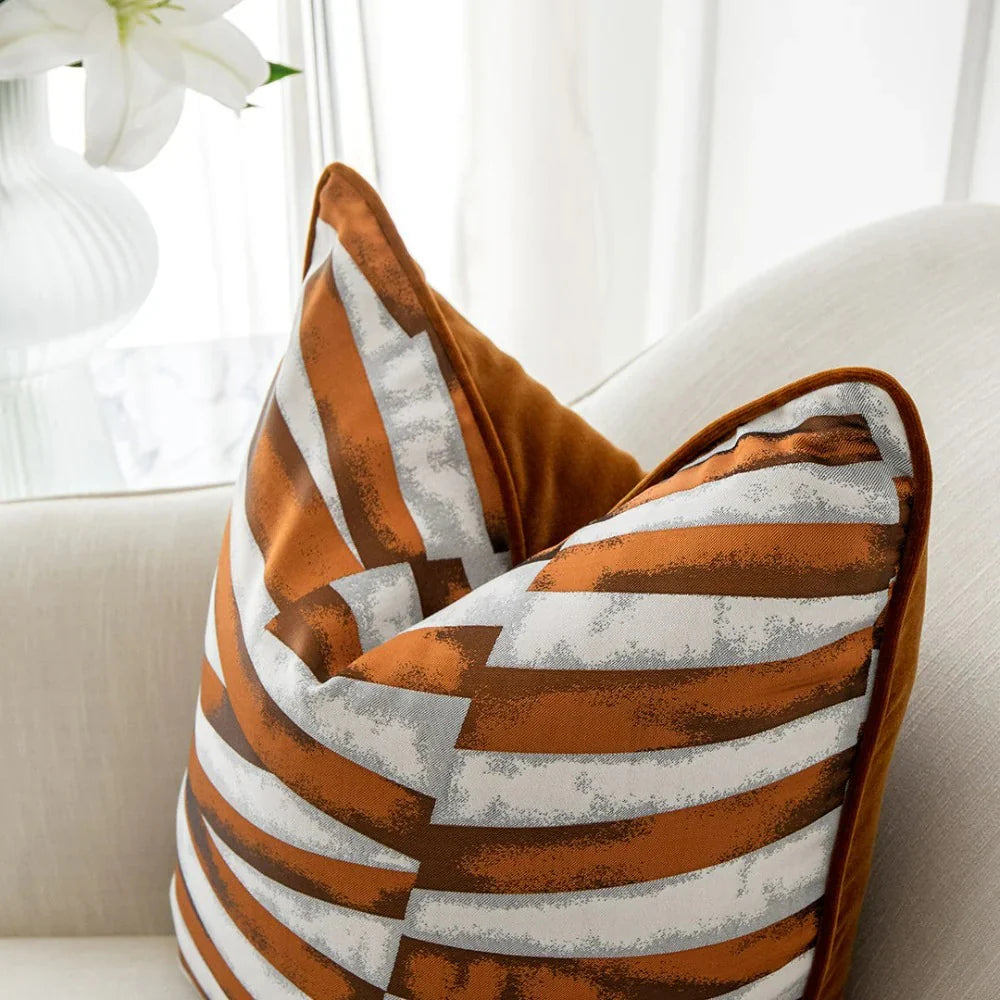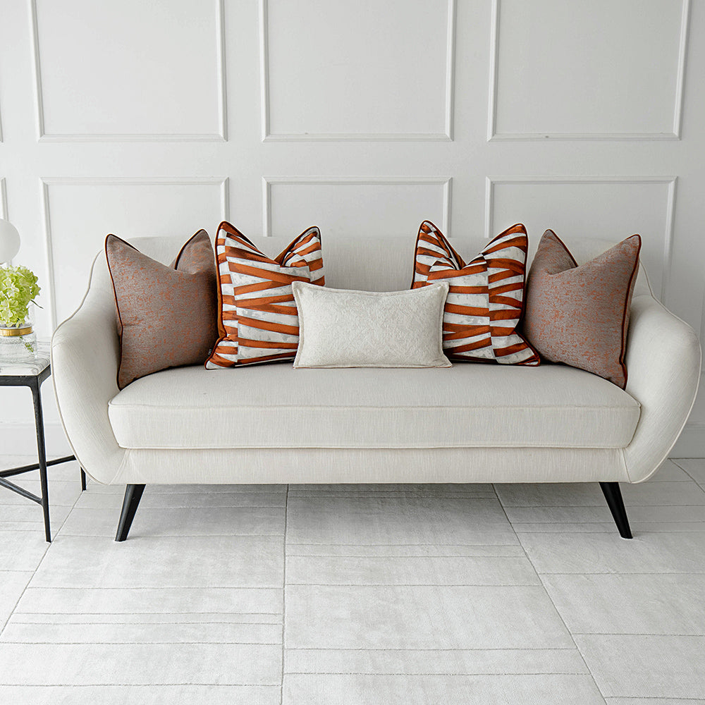 Design: Two orange, white and grey 3D pattern cushions, two grey cushions and a white accent cushion
