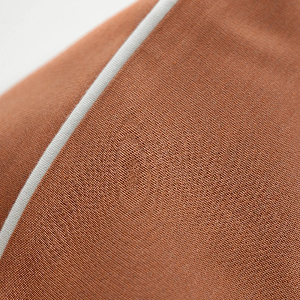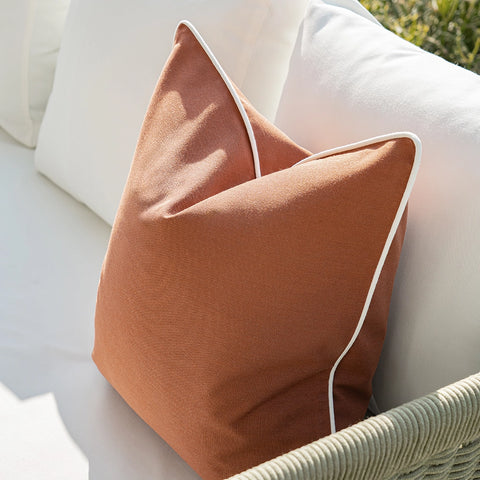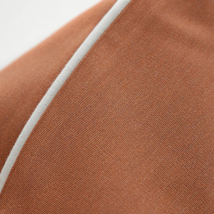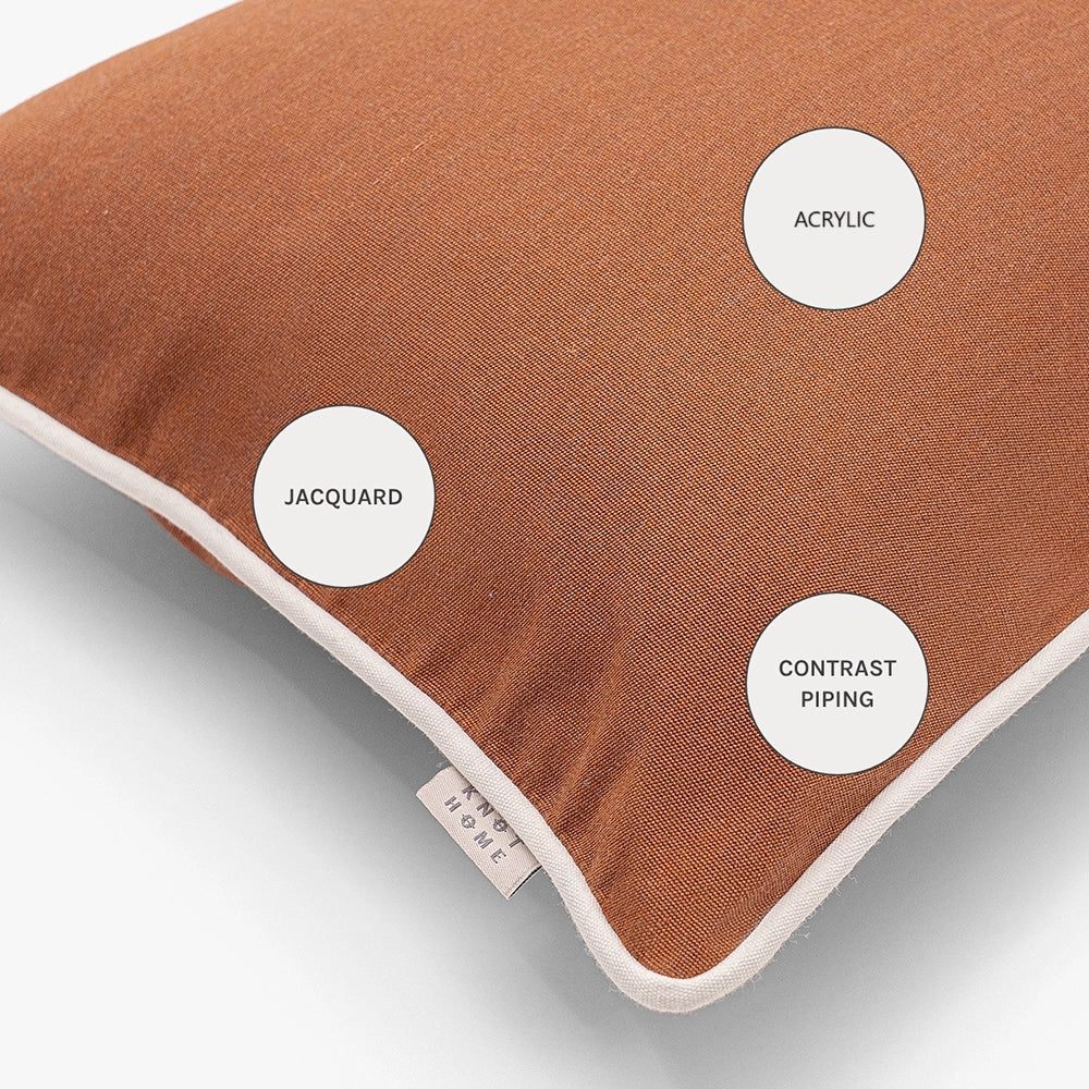 A warm rust cushion with a smooth, finely knit surface and soft contrast edging, bringing gentle structure and an inviting, earthy calm to the space.
