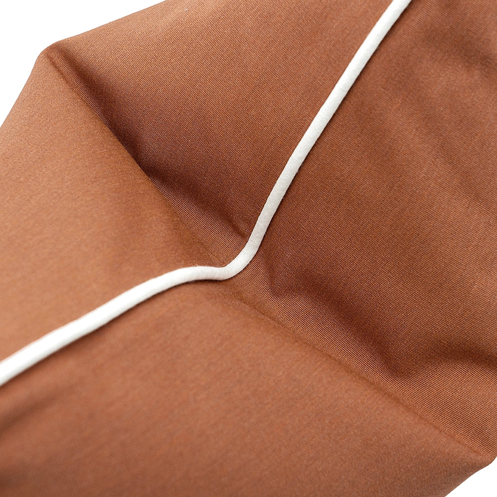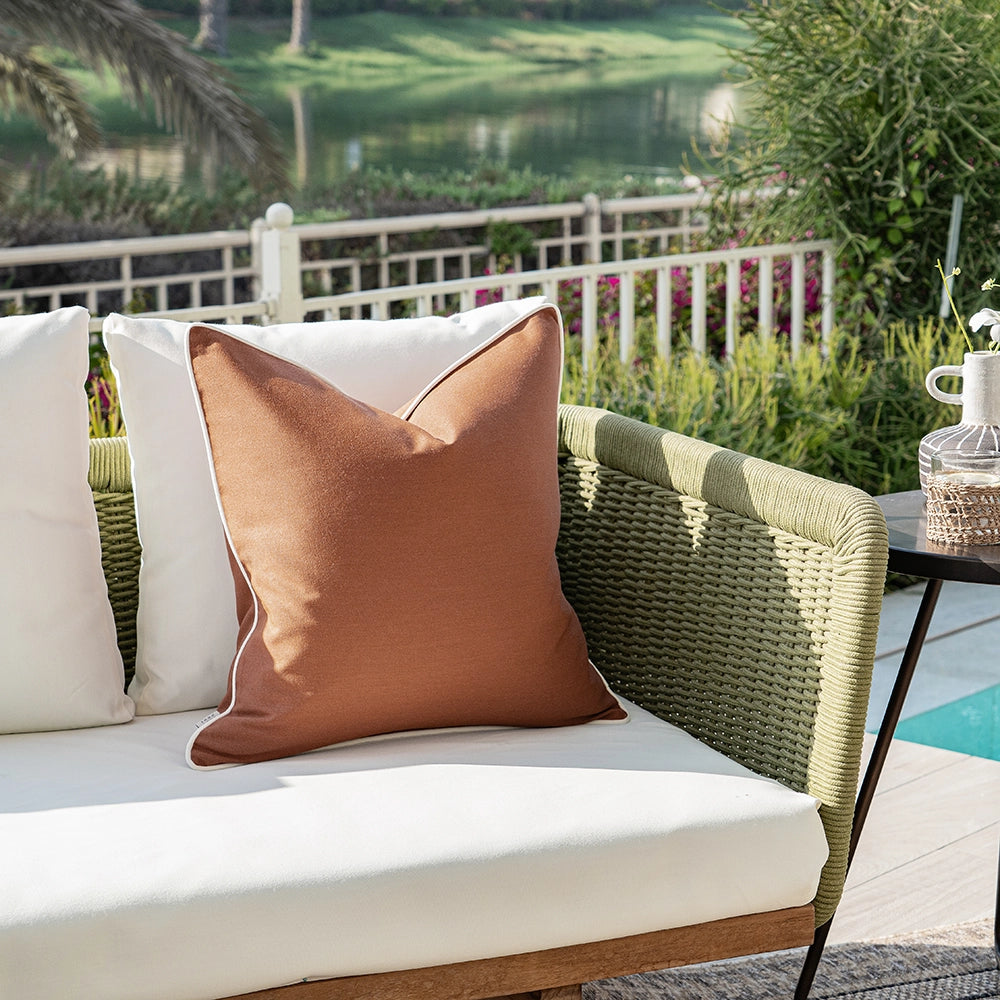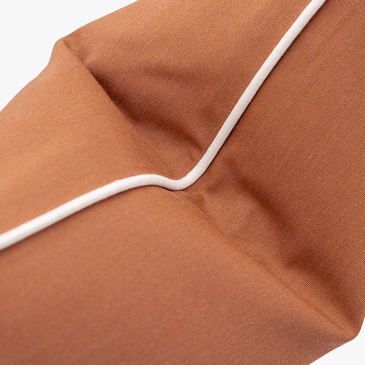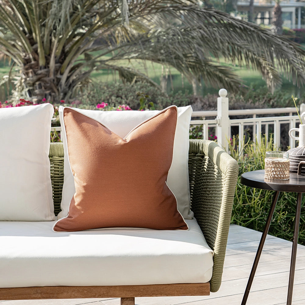 A warm rust cushion with a smooth, finely knit surface and soft contrast edging, bringing gentle structure and an inviting, earthy calm to the space.