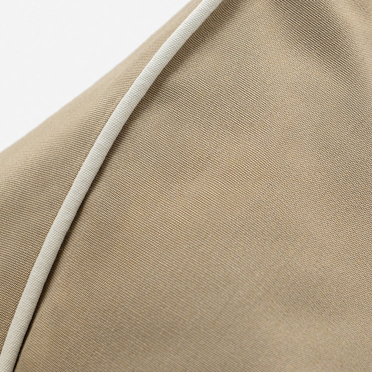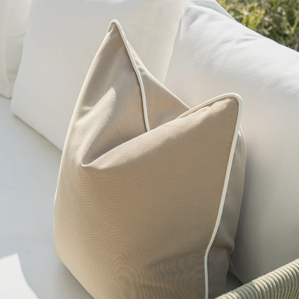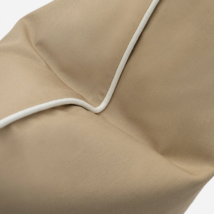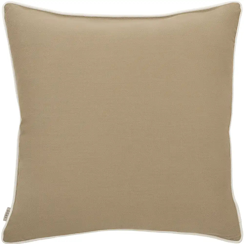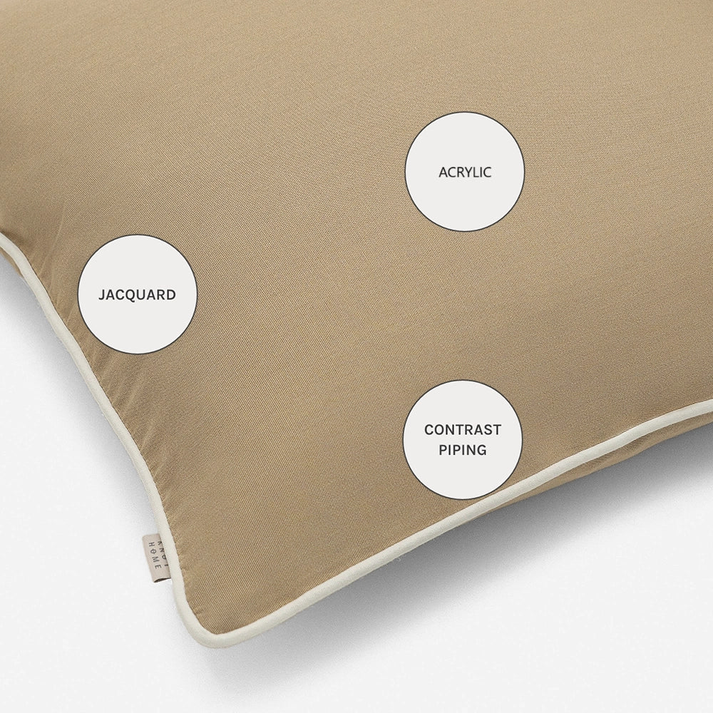 A soft mocha cushion with a smooth, finely knit surface and gentle contrast edging, offering a calm, understated warmth with subtle texture.