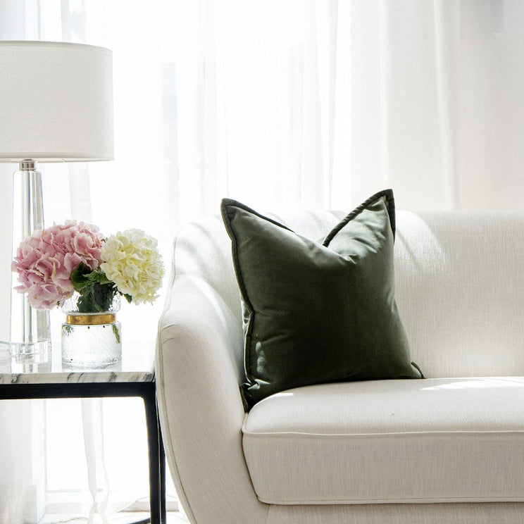Our Alessandra Forest cushion comes in a chic shade of dark olive green. This plain velvet cushion has a soft, plush texture that will elevate any cushion arrangement.