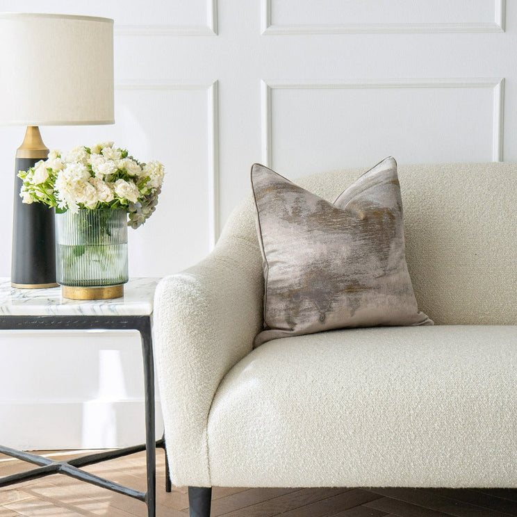 Our Alma Klimt gold decorative cushion will work well with any style of decor. This silver and gold cushion is made from art silk and features a shimmering watercolour-style jacquard pattern.