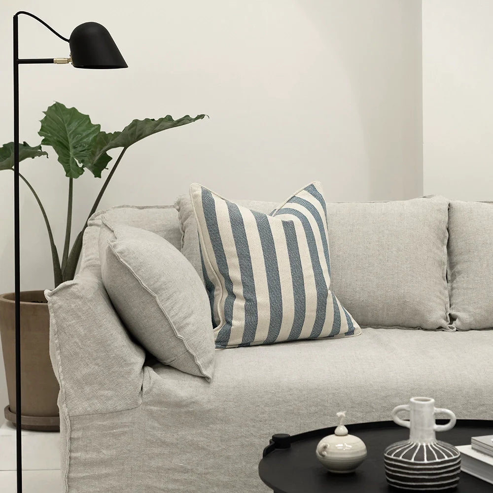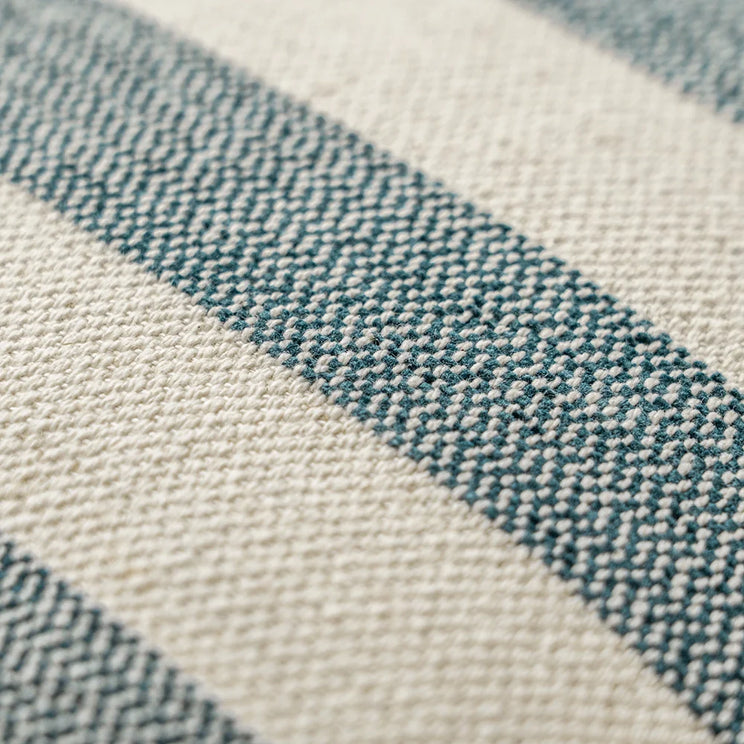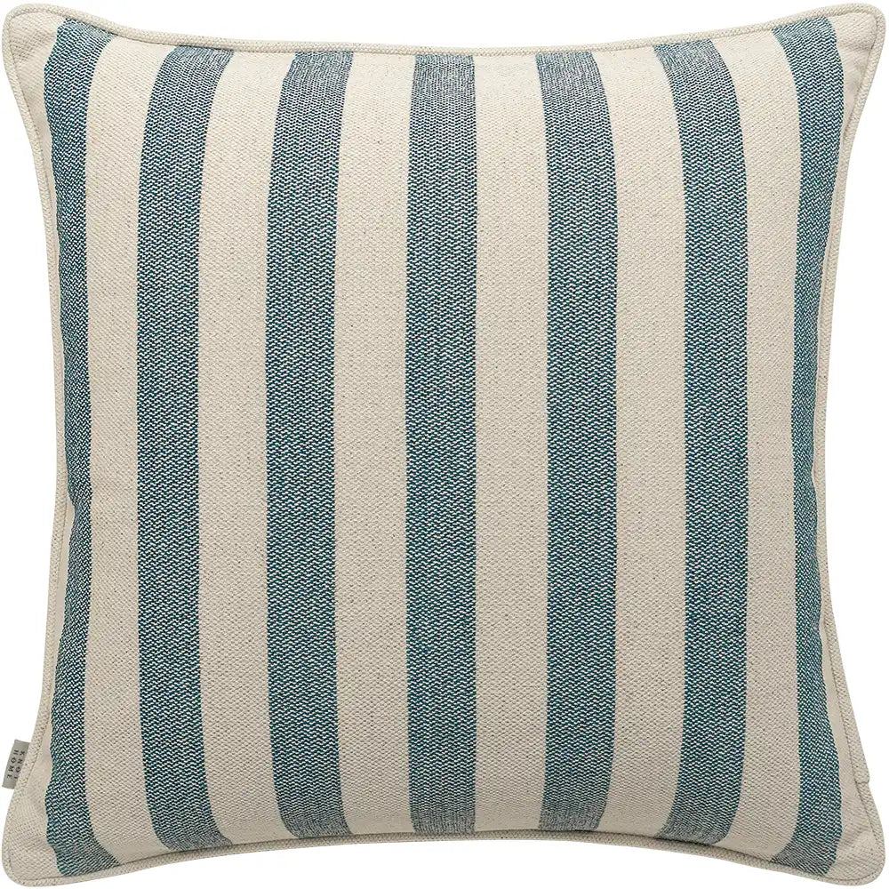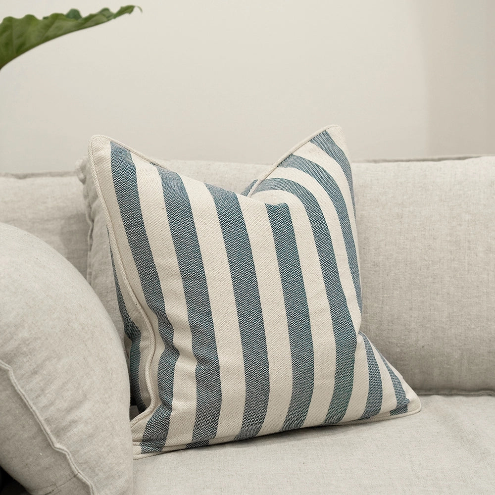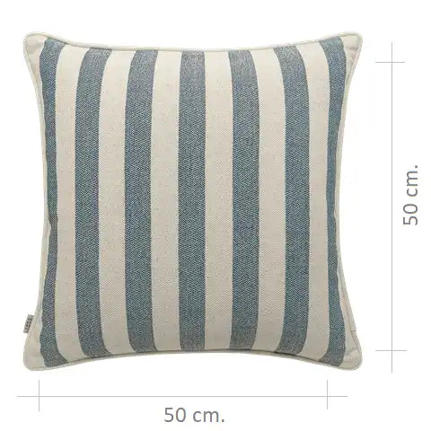 This blue and white striped cushion has a breezy seaside aesthetic. In pure cotton, the cushion has wide stripes front and back to transform your living space into a coastal retreat.