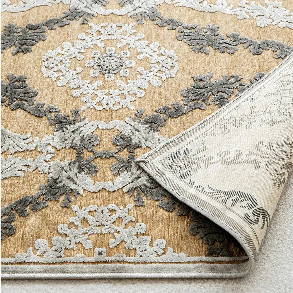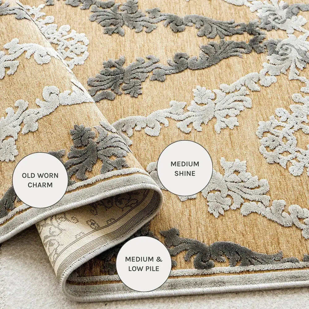 Design: The beige carpet is adorned with an ornate raised leaf and teardrop pattern in grey and gold and has a chic narrow border. It’s made from a polyester and viscose mix for a semi-shiny texture that catches the light beautifully.
