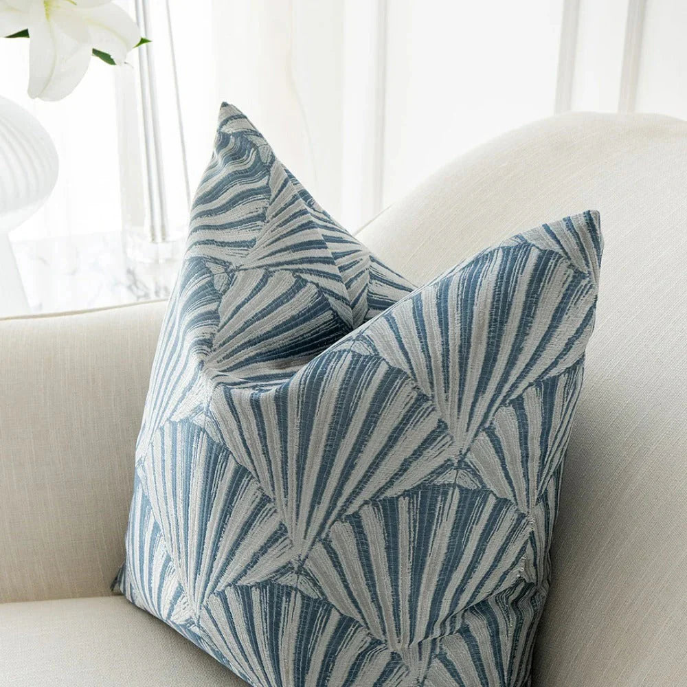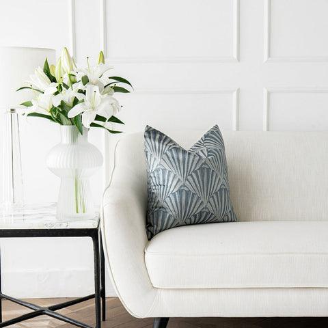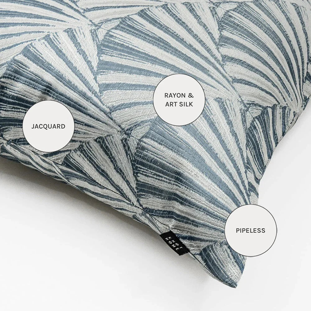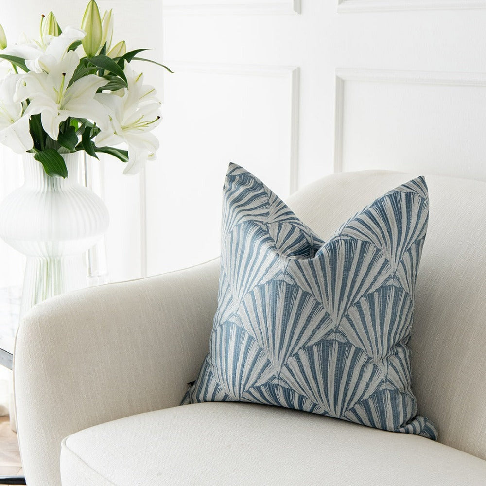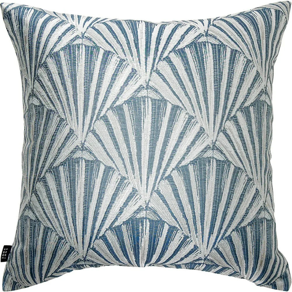 In rayon and art silk, our Ashlyn Canova jacquard cushion features a repeating shell pattern in cool tones of silver and blue. This shiny cushion will bring the ocean to your interior.