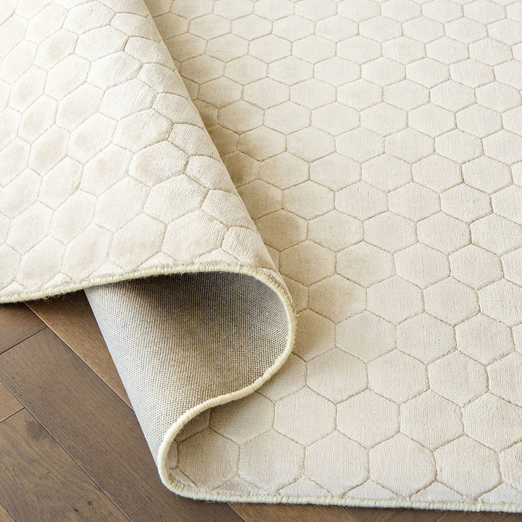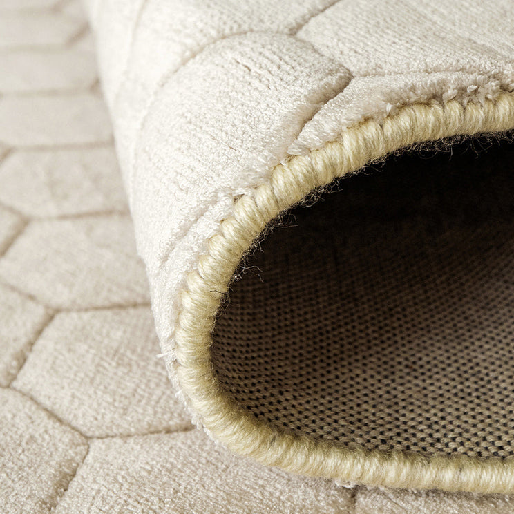 This cream carpet has a honeycomb texture for understated elegance. Our Becket Bianca rug is made from art silk with a medium shine to add a gloss to any room.