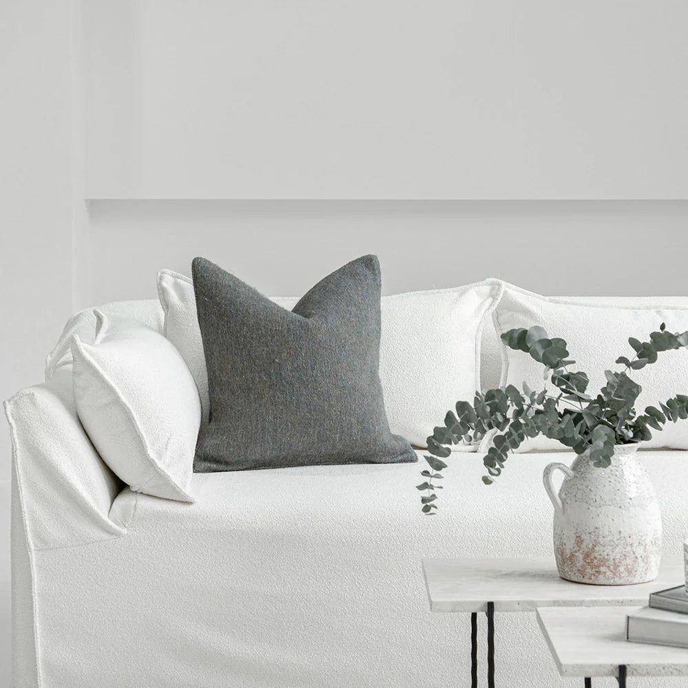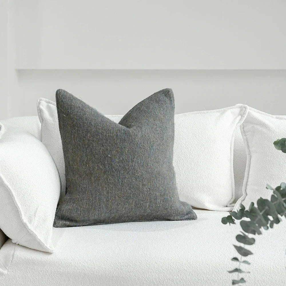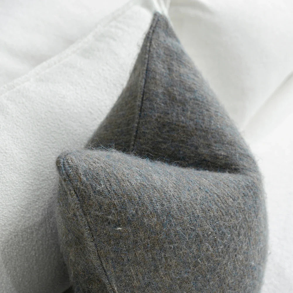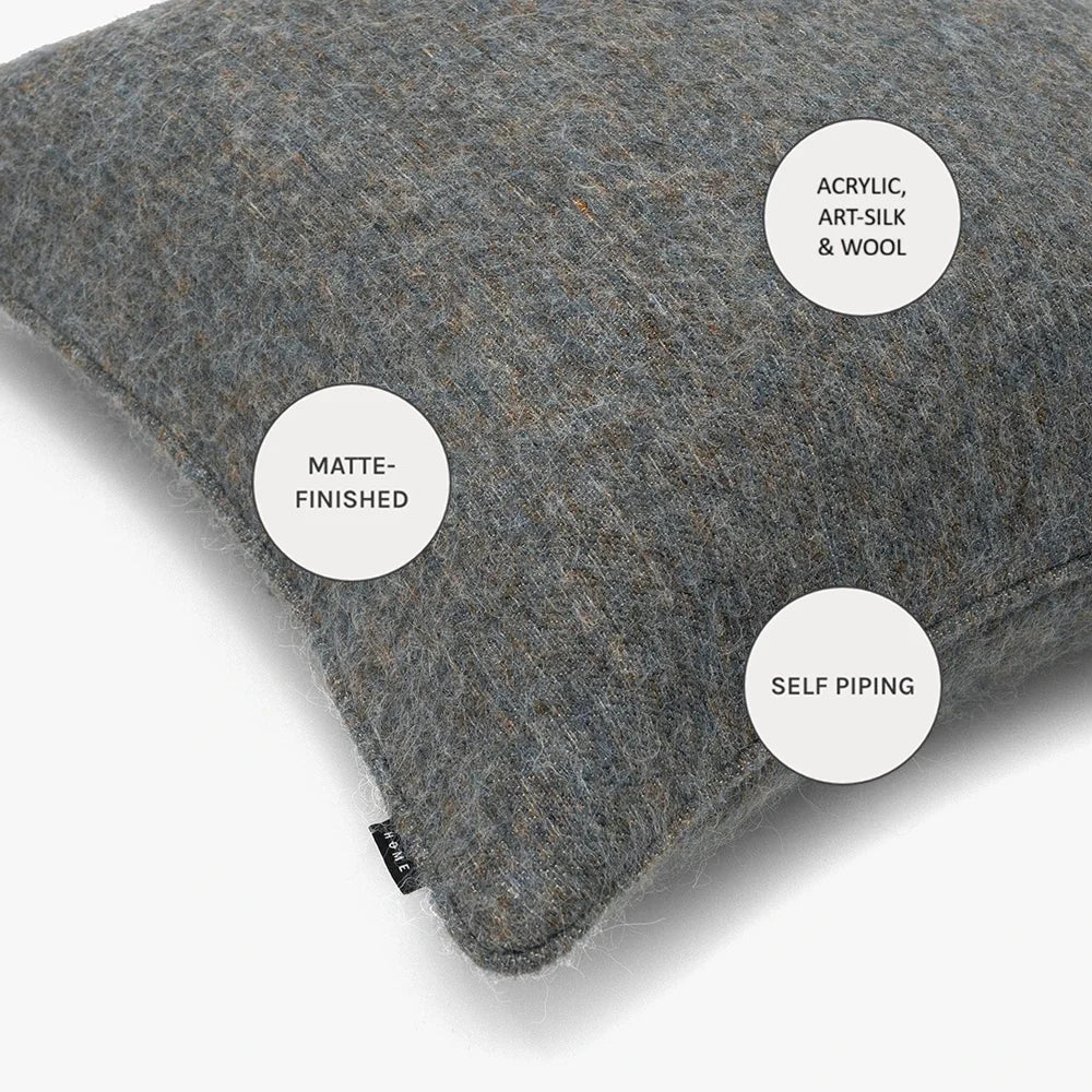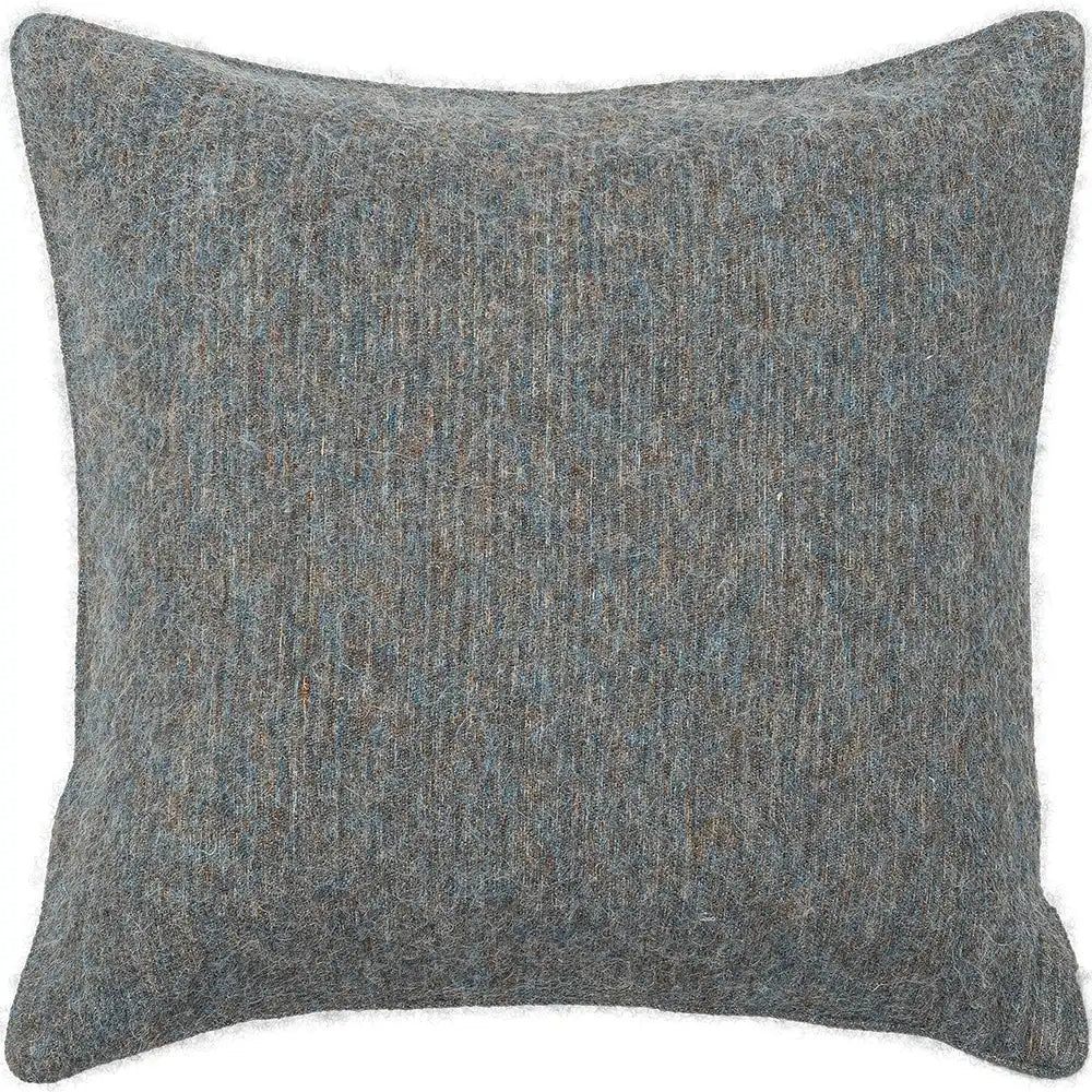 A softly textured wool-blend cushion woven with a calming mix of earthy grey, muted blue, and a gentle warm undertone. The blend creates a rich, quiet depth that feels both natural and elevated, with a warm, inviting handfeel.