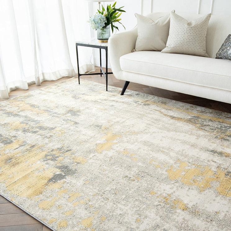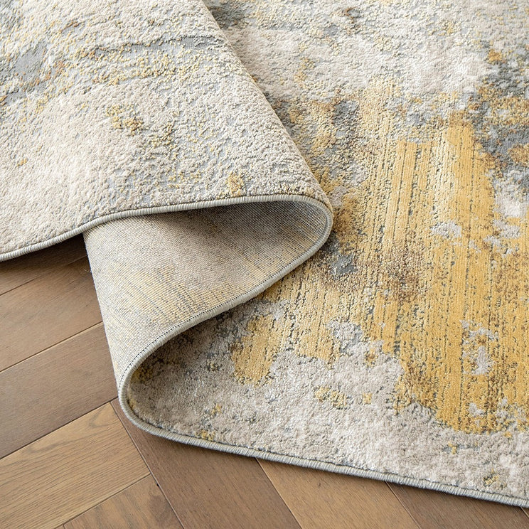 This grey and gold abstract carpet has a crackled effect to give it a unique character.