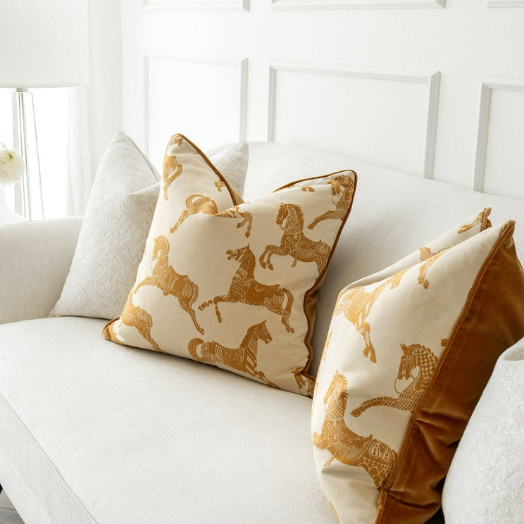 Brighten up your living space with our Alona bundle. This set features two white cushions with a criss-cross design in metallic thread, and two cushions with carousel horses dancing across the front.
