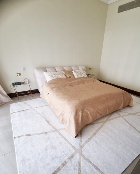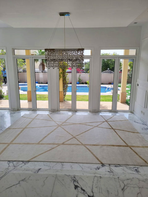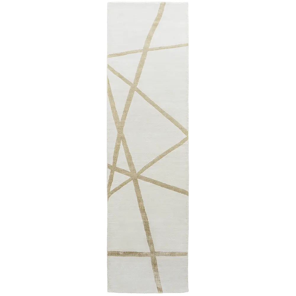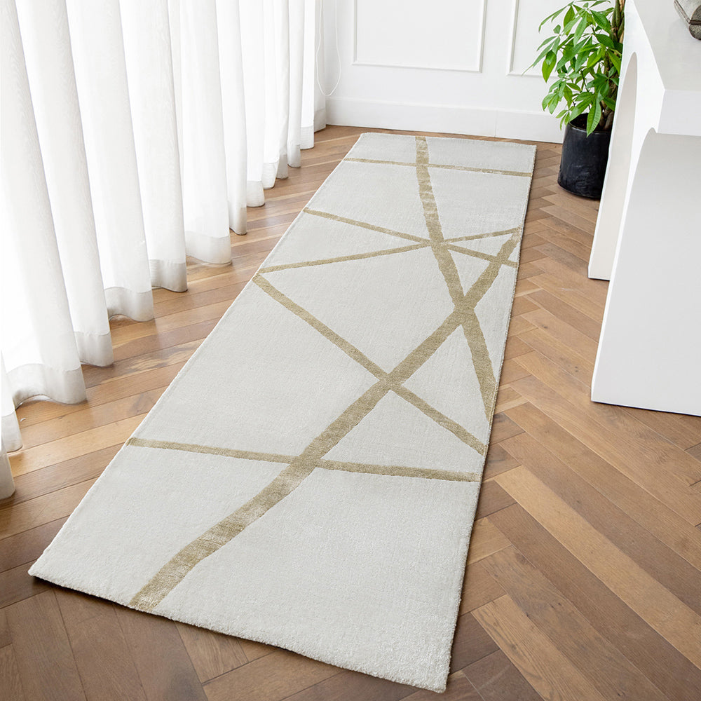 In off-white and gold, this modern carpet has a minimalist pattern that will complement any style of décor.