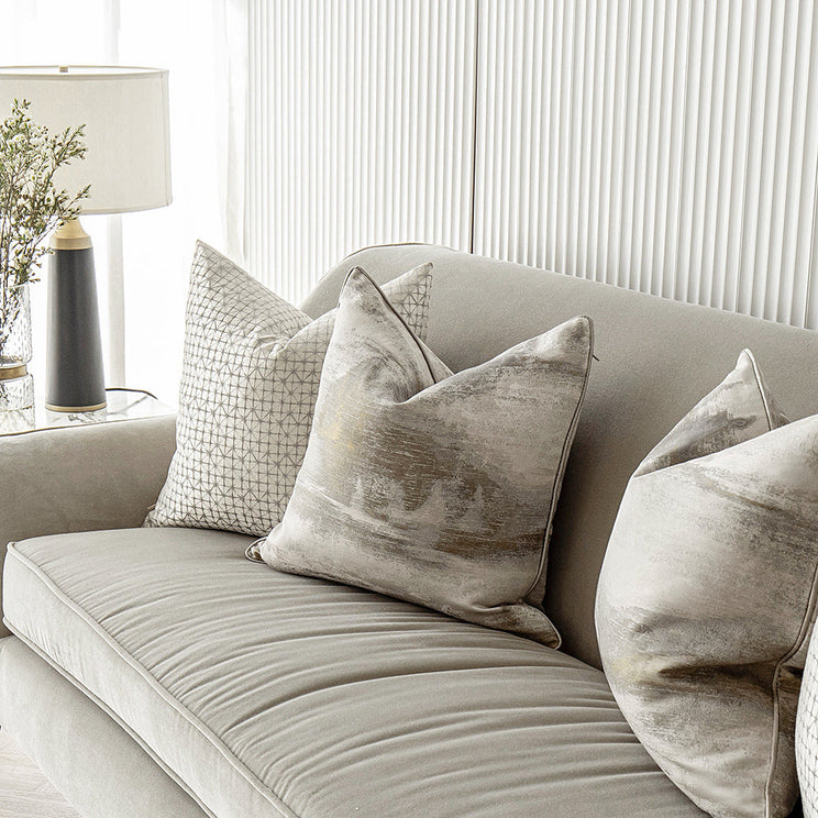 Design: Two silver cushions with a diamond pattern and two silver and gold watercolour-effect cushions