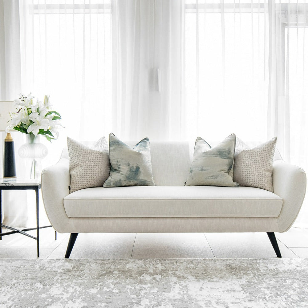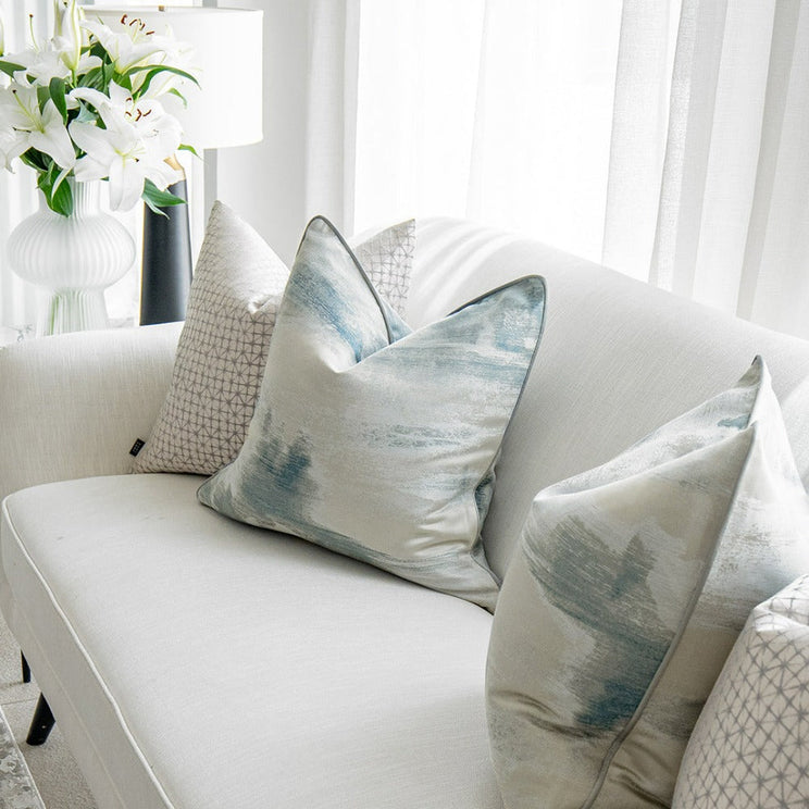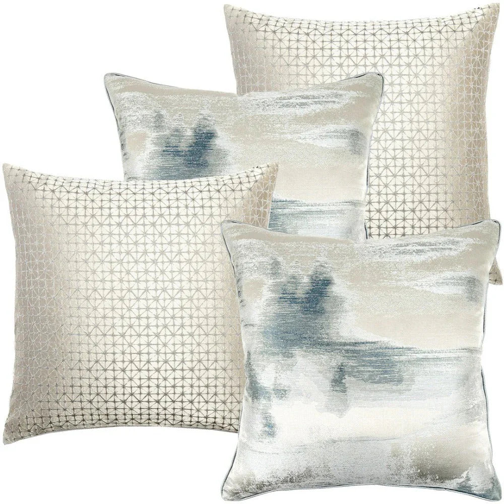 Design: Two silver diamond pattern cushions and two watercolour pattern cushions in blue and silver