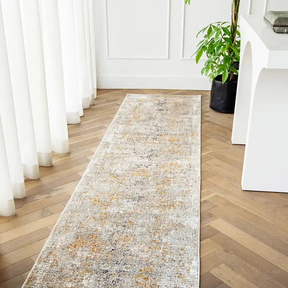 This abstract stripe carpet from our Ethan collection has been faded in places for a love-worn vintage aesthetic.