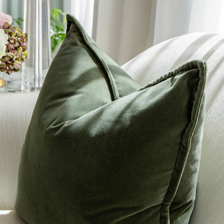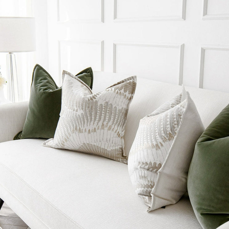 Highlighting bold colour contrasts and contemporary design, this best-selling cushion set includes two forest green velvet cushions and two feather patterned cushions with delicate gold and silver accents.
