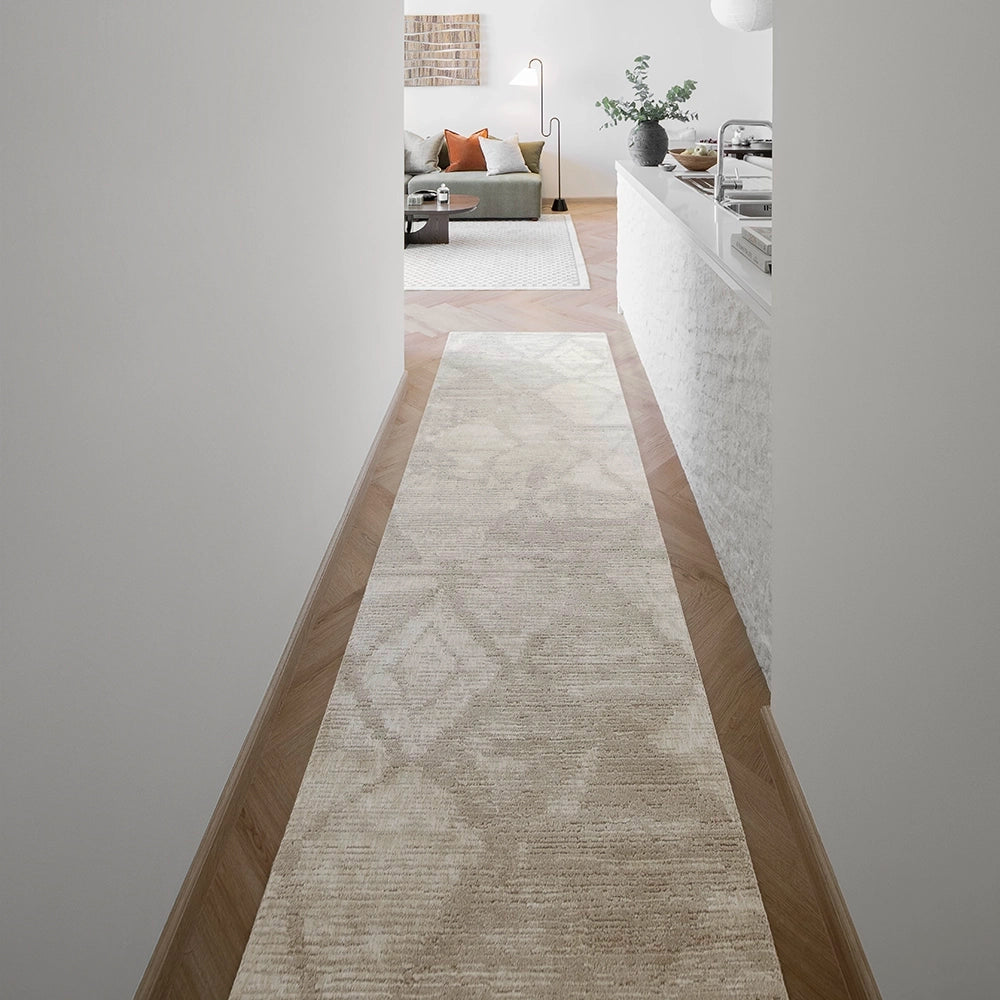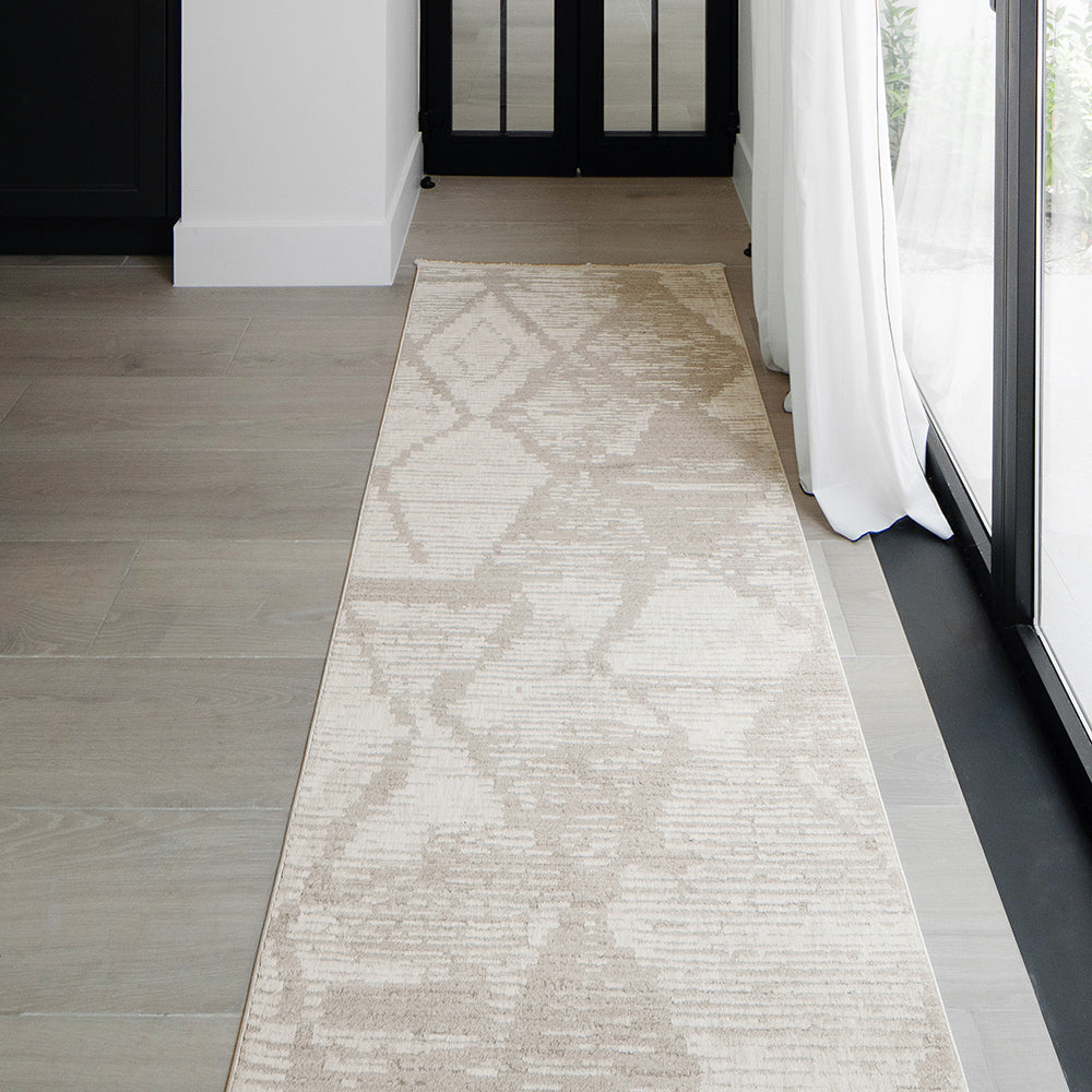 A contemporary neutral rug for your home, this beige carpet features a modern diamond pattern for an elevated look.