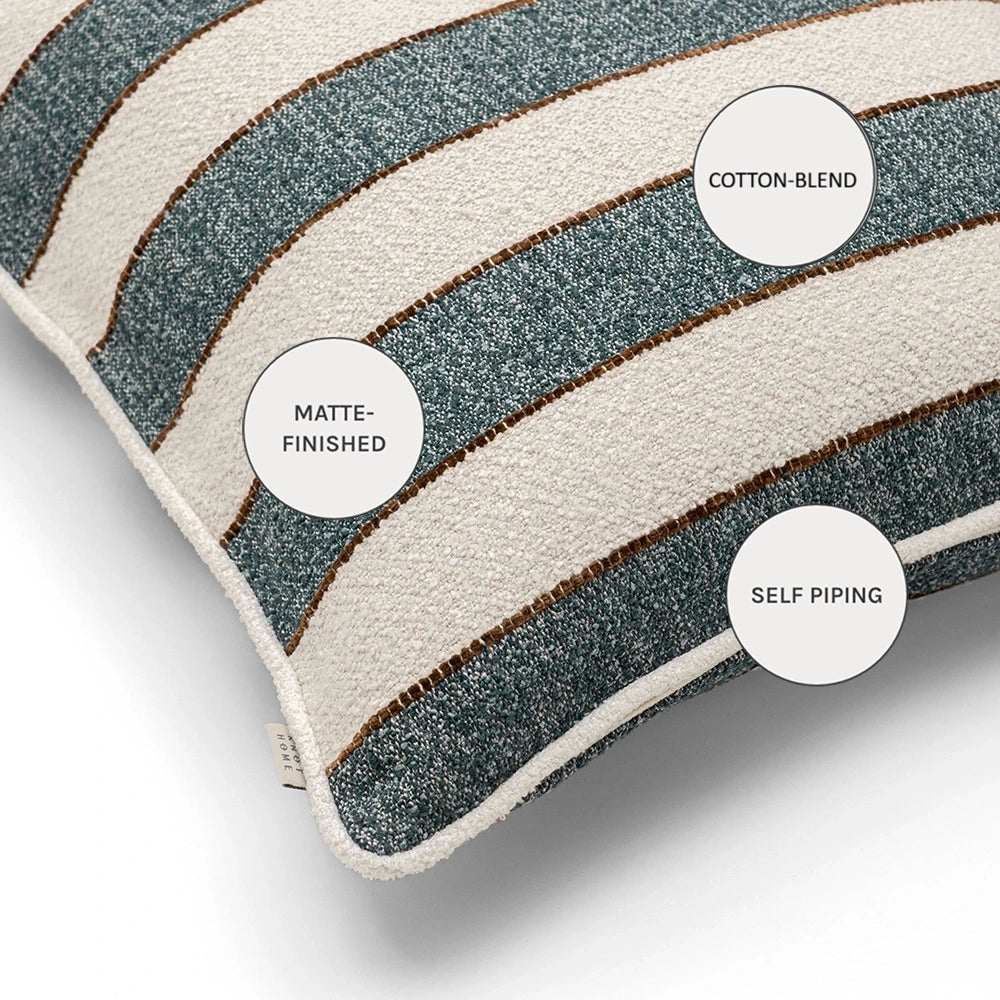 A textured bouclé cushion with broad stripes and subtle contrast, blending relaxed charm with refined craftsmanship. Its tactile weave brings depth and quiet character to any space.