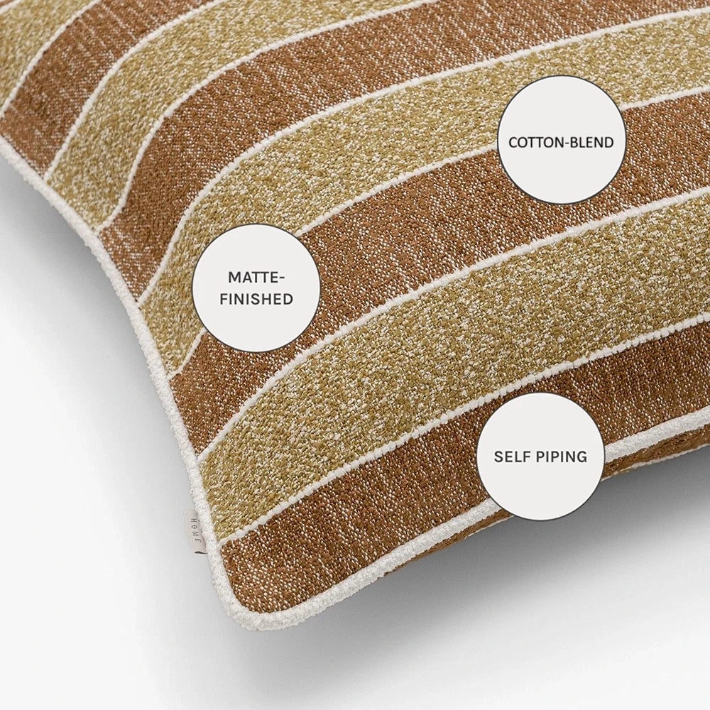 Design: Bold horizontal stripes in a nubby woven texture; alternating wide rust-brown and mustard bands divided by fine ivory lines; clean, tailored edge