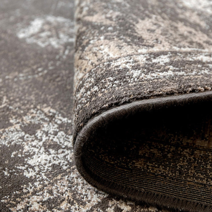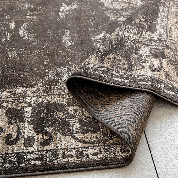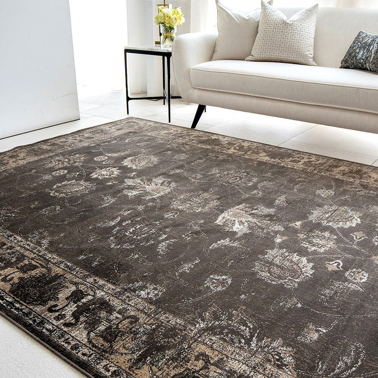 In a sophisticated shade of dark brown, this distressed carpet is a vintage style that even minimalists will fall for.