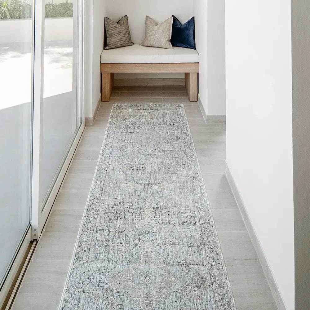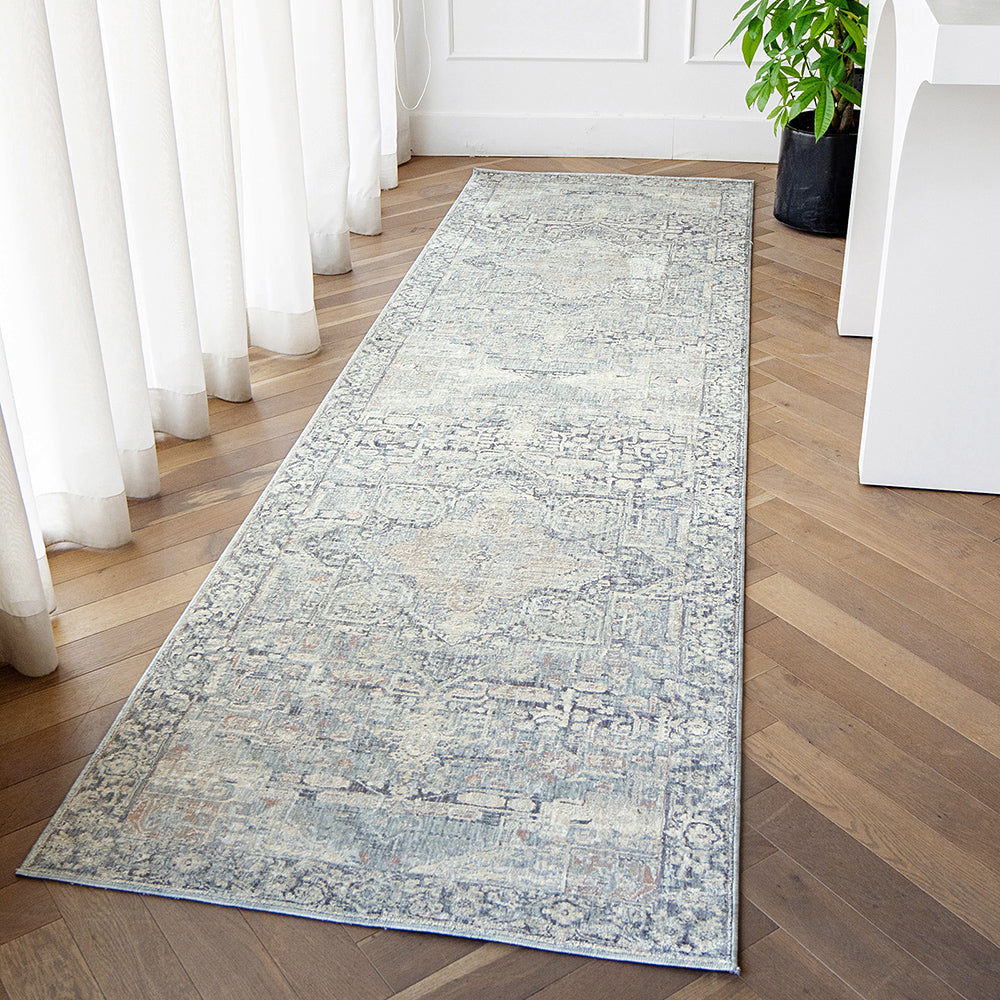 Our Hana rustic rug comes in a beautiful blue colour palette with deliberate fading for vintage appeal.