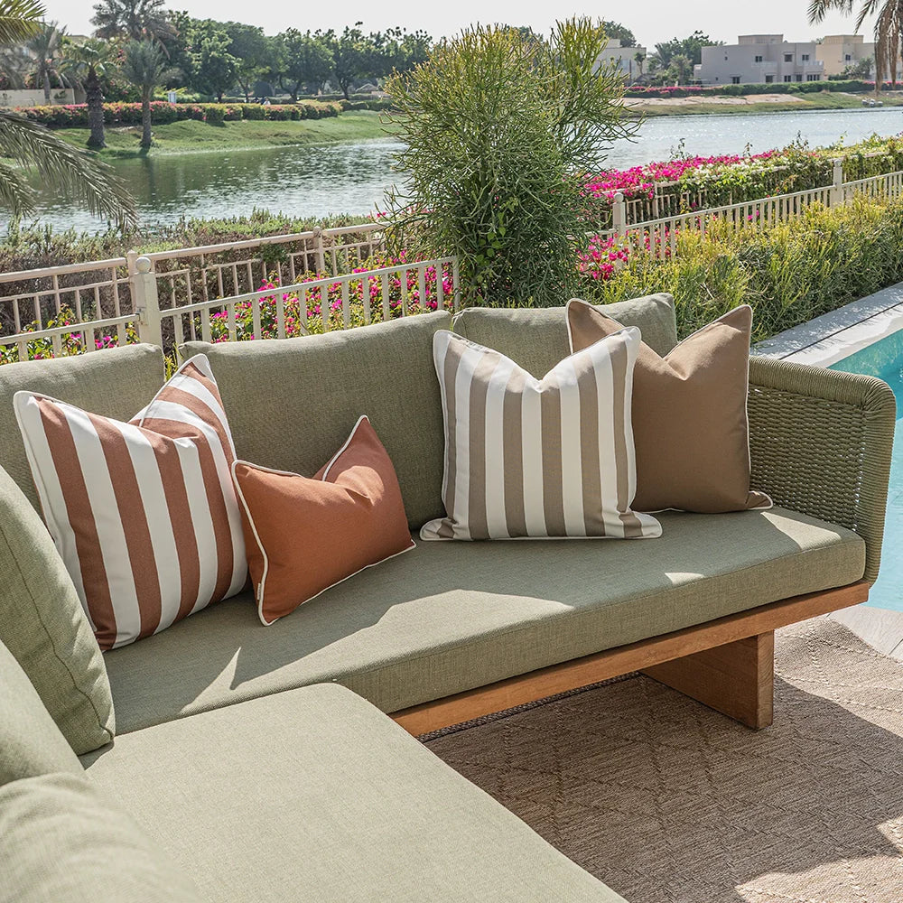 Set the scene for outdoor entertaining with this four-piece cushion set. Two wide striped cushions are teamed with a plain brown cushion, with a vivid rust accent cushion for a bold final flourish.